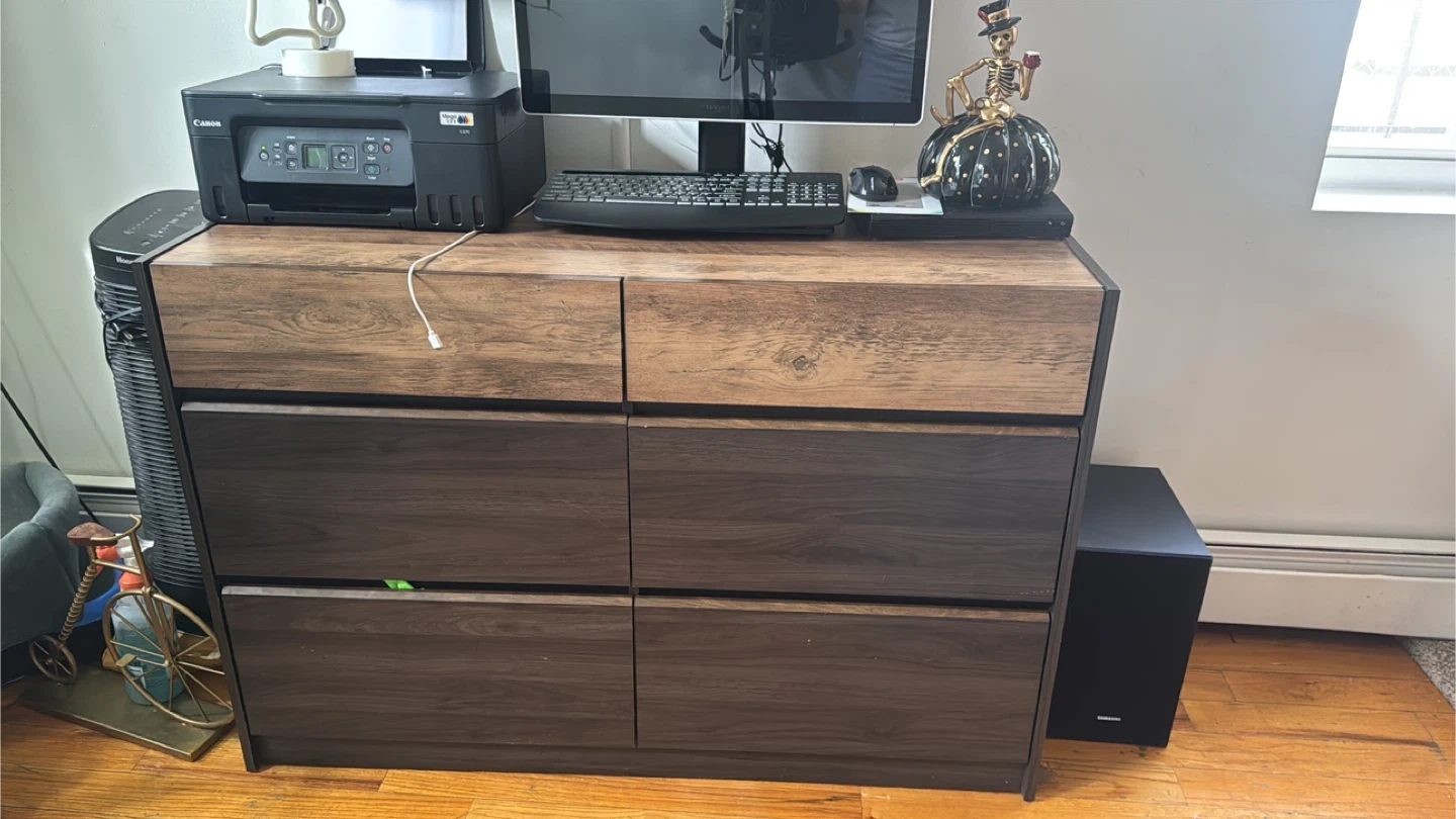 This dresser features a modern wood-grain finish with six spacious drawers. It's a practical storage solution for any bedroom. The top two drawers have a lighter wood tone, while the bottom four are a darker shade.l