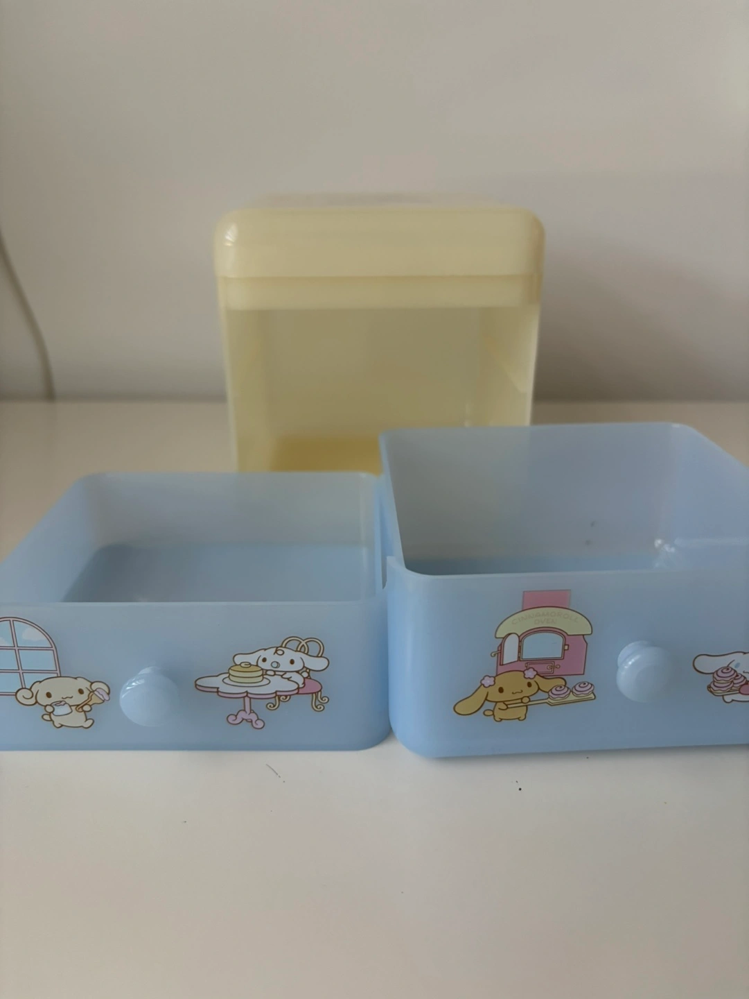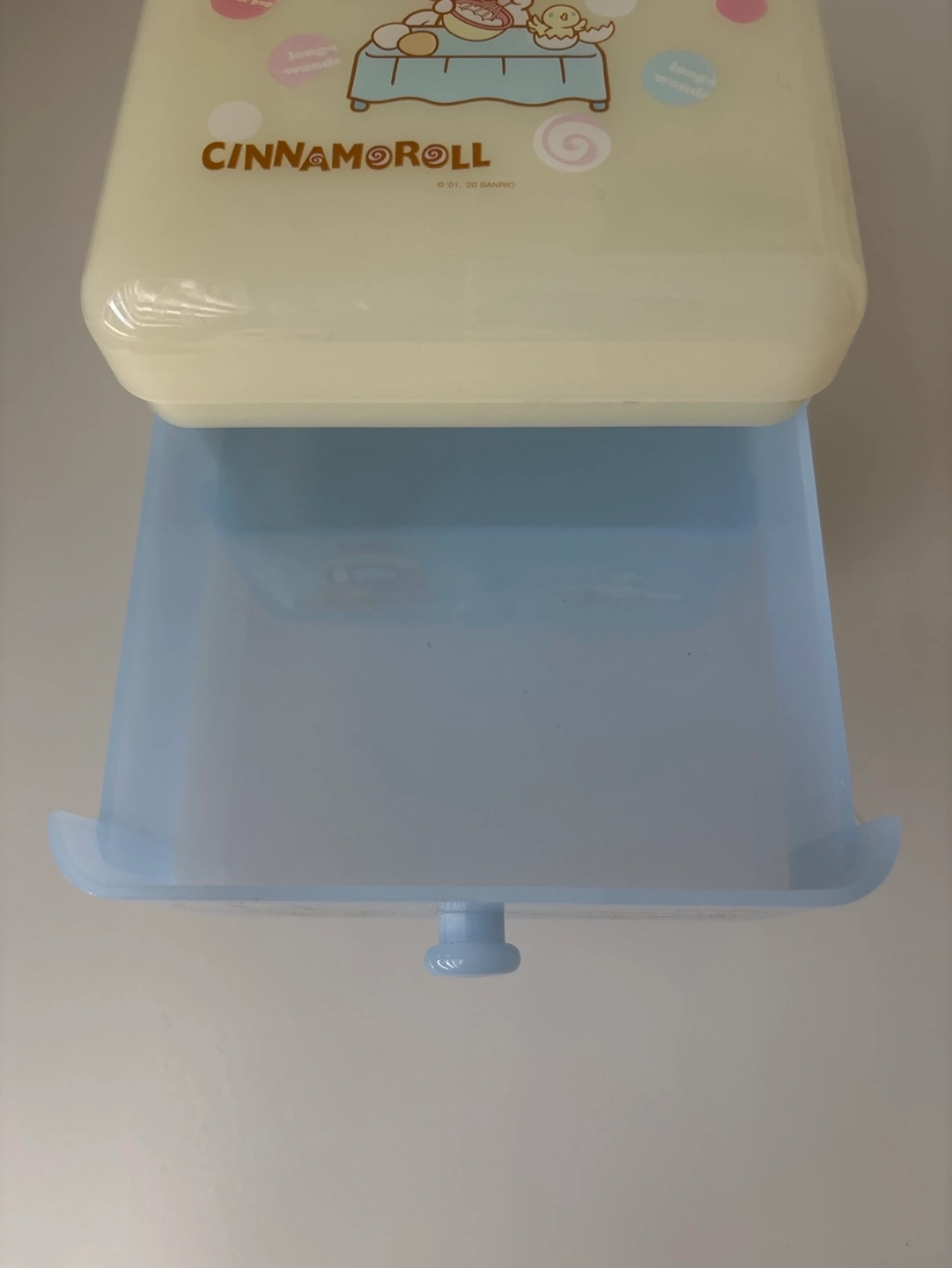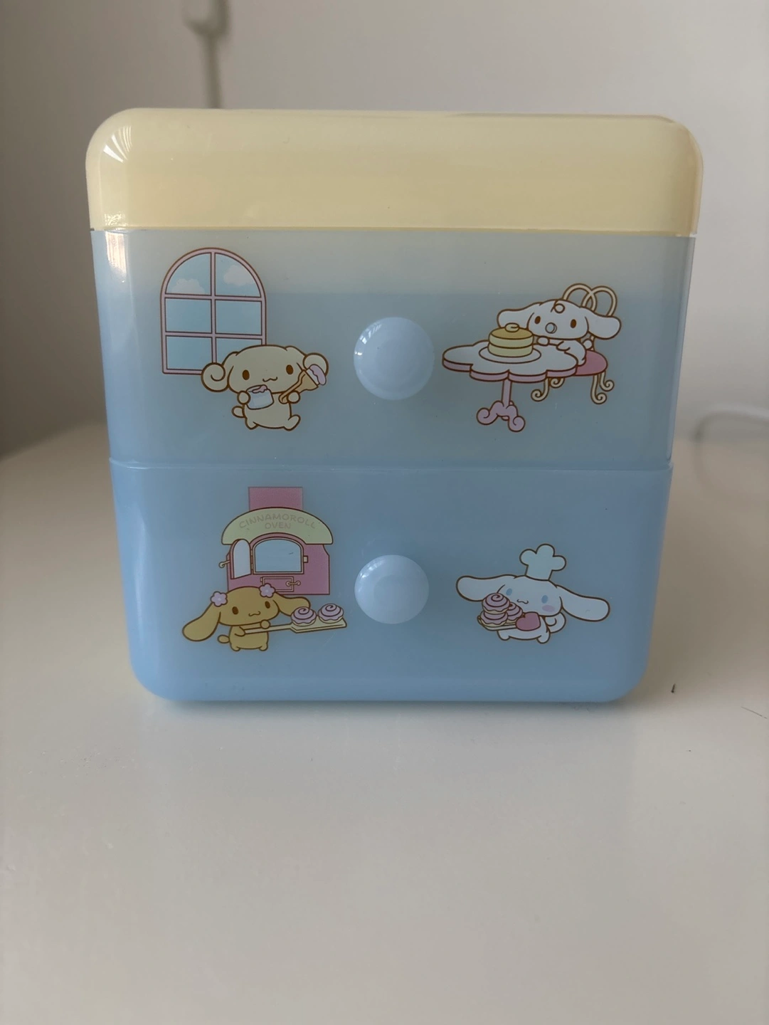 Cute Cinnamoroll storage box with two drawers. Bottom drawer is bigger than the top two ones. Top drawer has a divider inside. Small, perfect for desk or vanity.