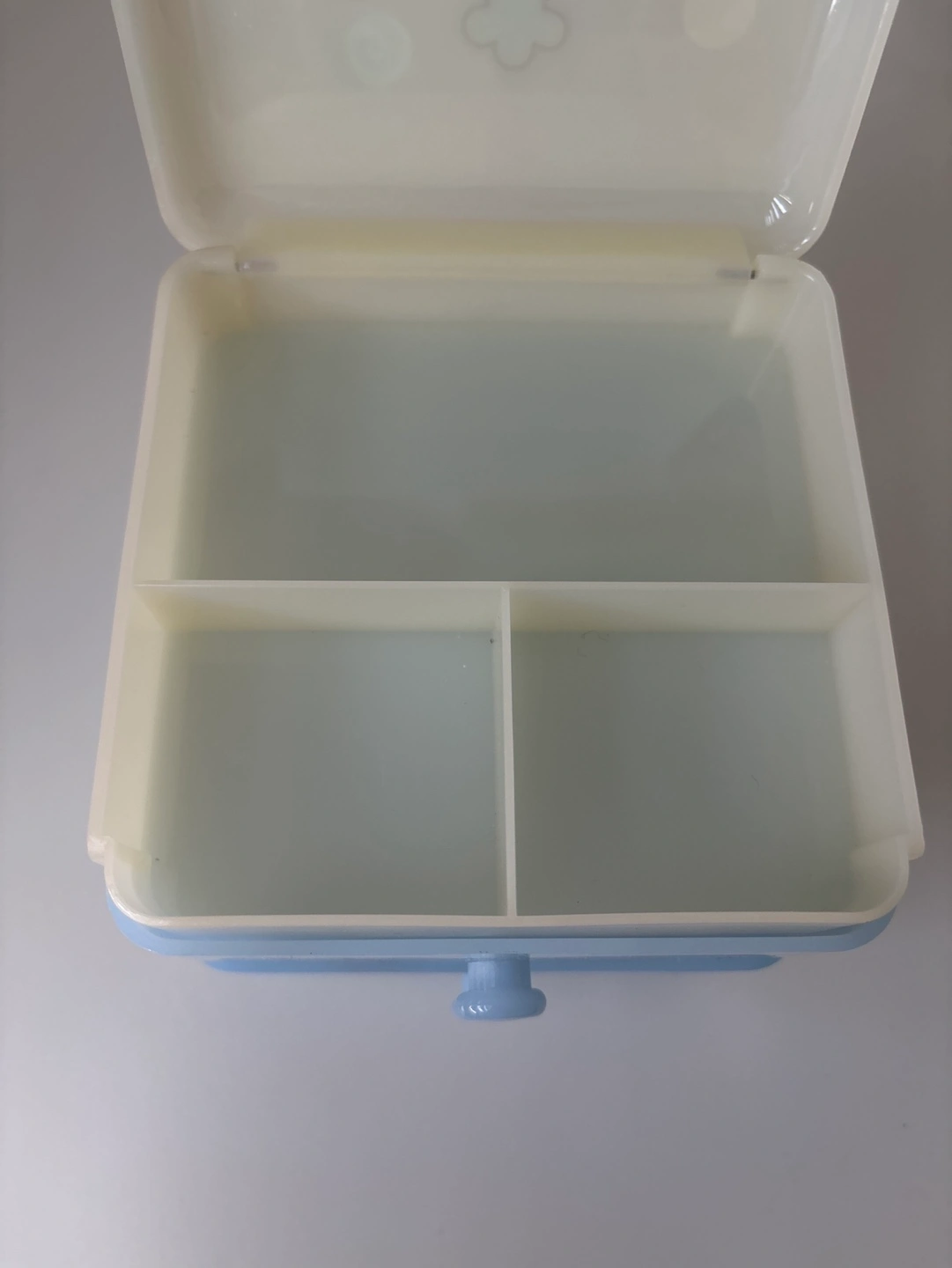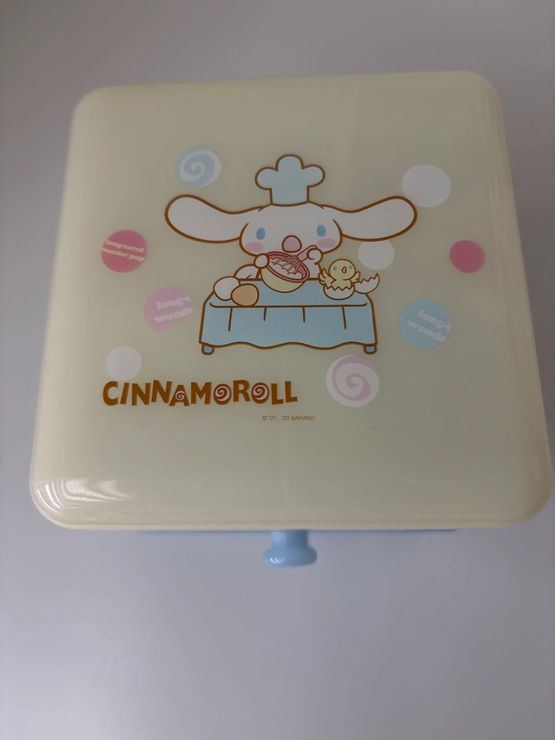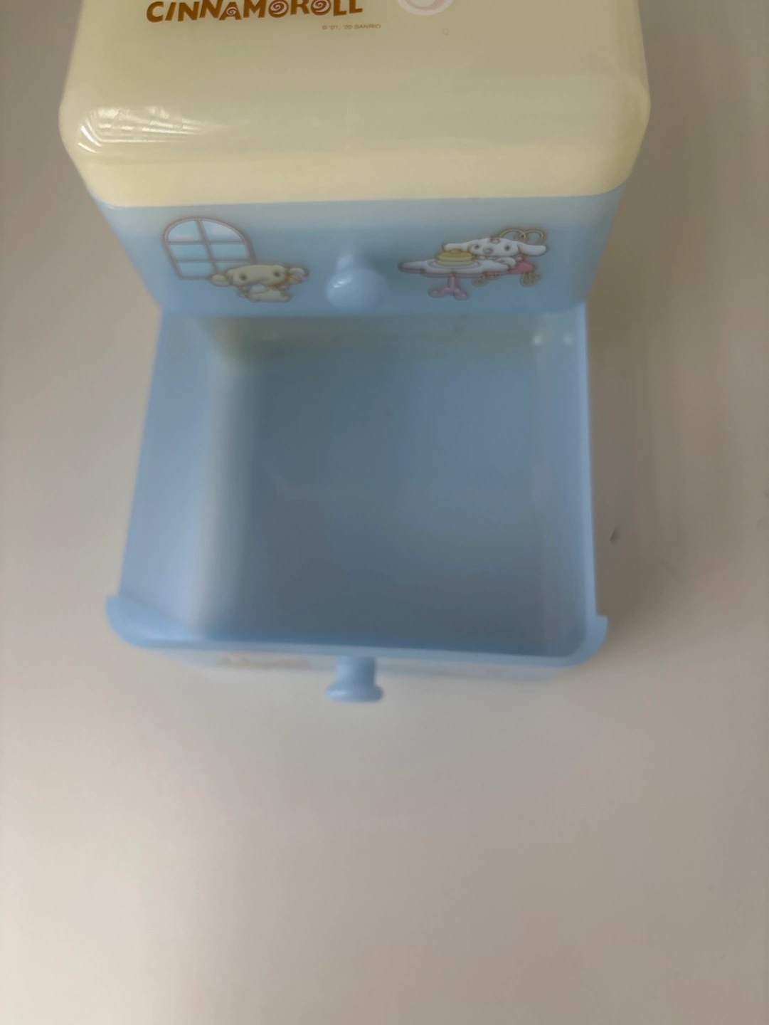Cute Cinnamoroll storage box with two drawers. Bottom drawer is bigger than the top two ones. Top drawer has a divider inside. Small, perfect for desk or vanity.