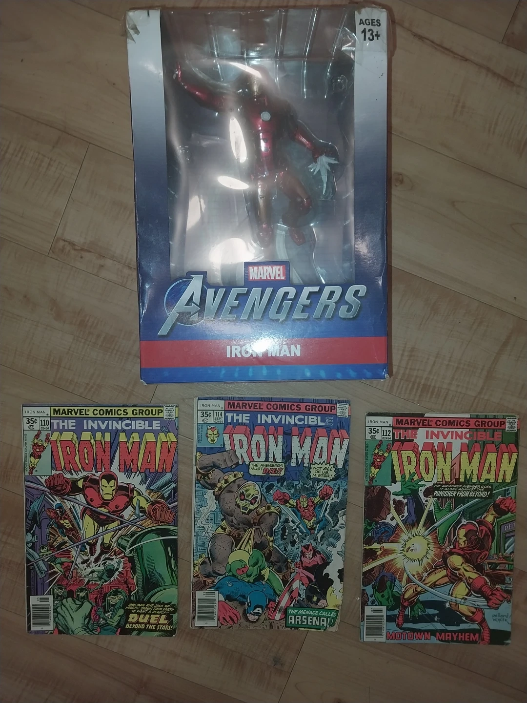 Marvel Avengers Iron Man action figure in its original packaging. It also comes with 3 Iron Man comic book.