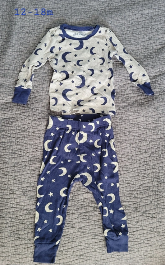 A two piece pajama set featuring long sleeves and pants with a crescent moon and star pattern. The set is size 12-18 months. used twice