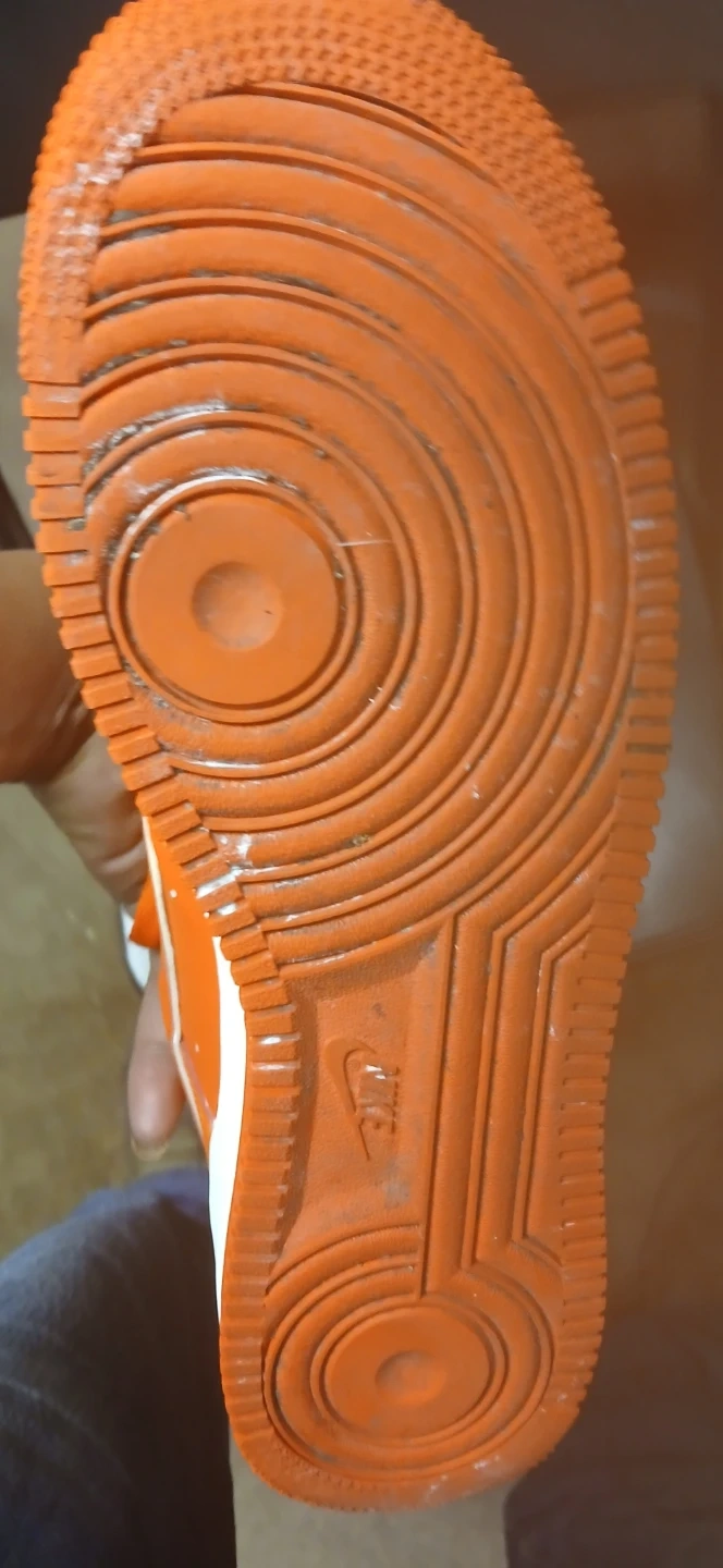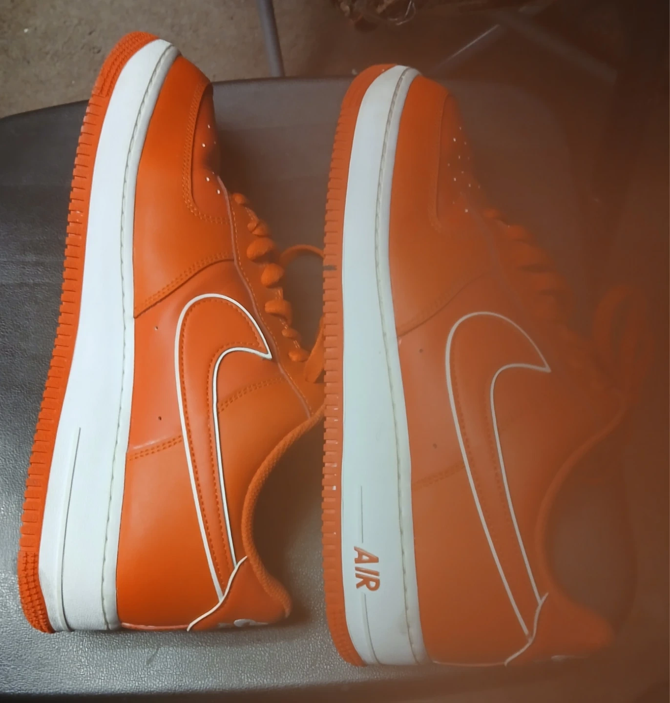 Selling a pair of Nike Air Force 1 Low sneakers in a vibrant orange color. These classic shoes feature the iconic Nike swoosh and are in good condition, ready for their next adventure!