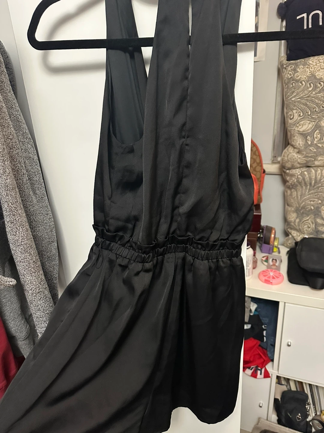 This black halterneck romper features a flattering wrap-style bodice and an elasticized waist for a comfortable fit. It's made from a silky material that drapes beautifully. Perfect for a night out or a special occasion! Pay by cash please