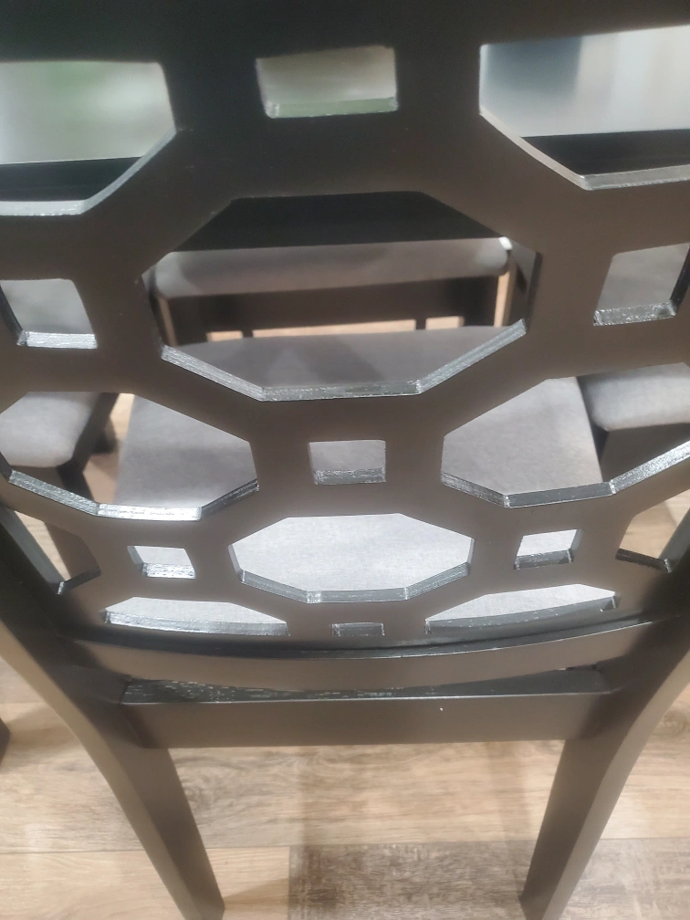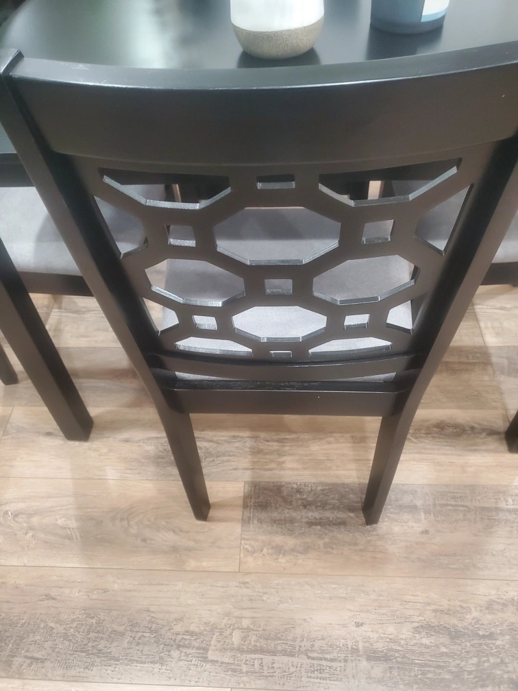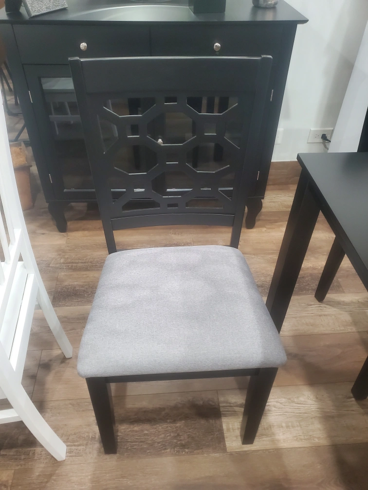 This dining chair features a black wooden frame with a decorative geometric backrest. It has a comfortable grey upholstered seat. Perfect for completing a dining set!