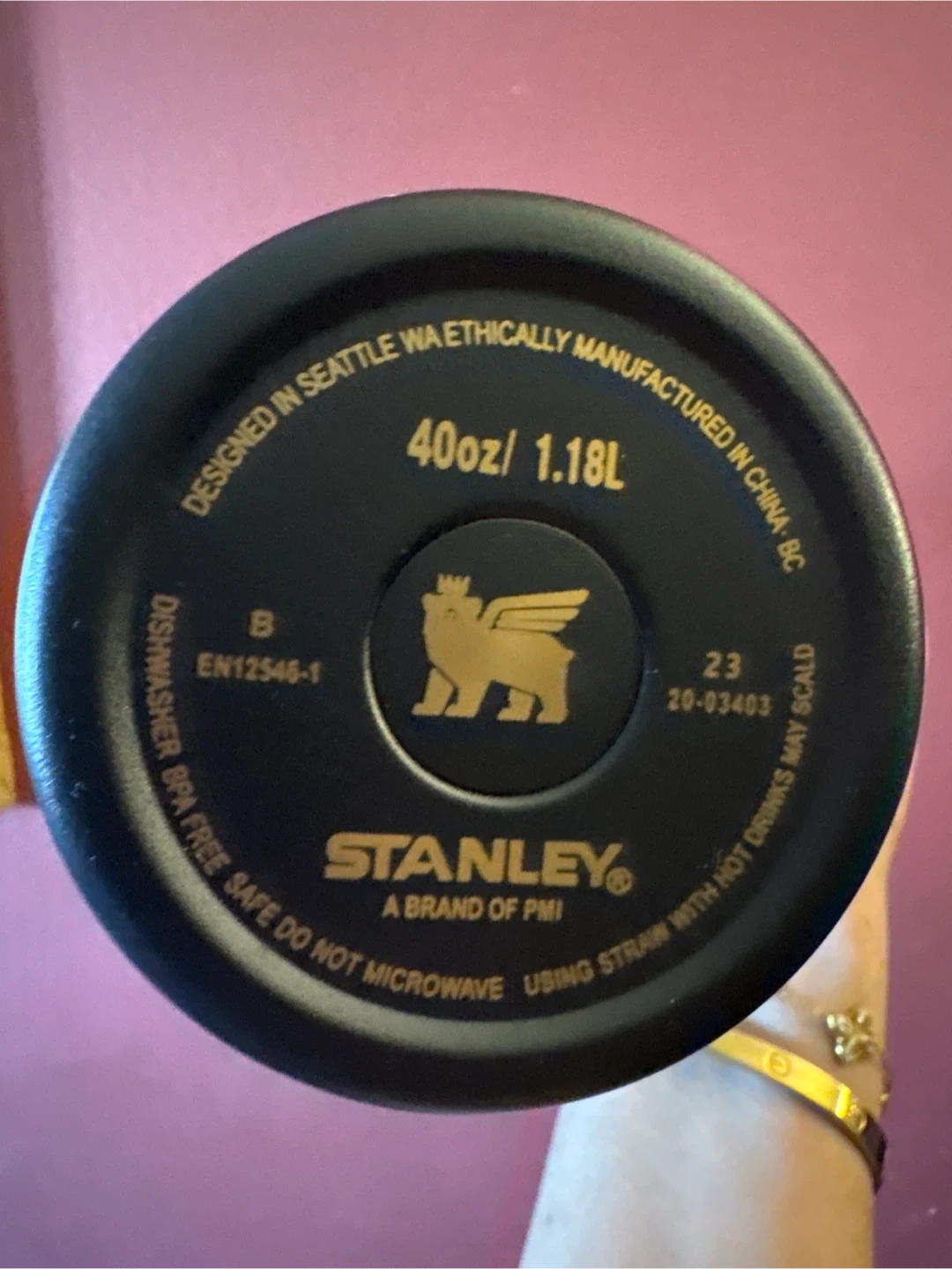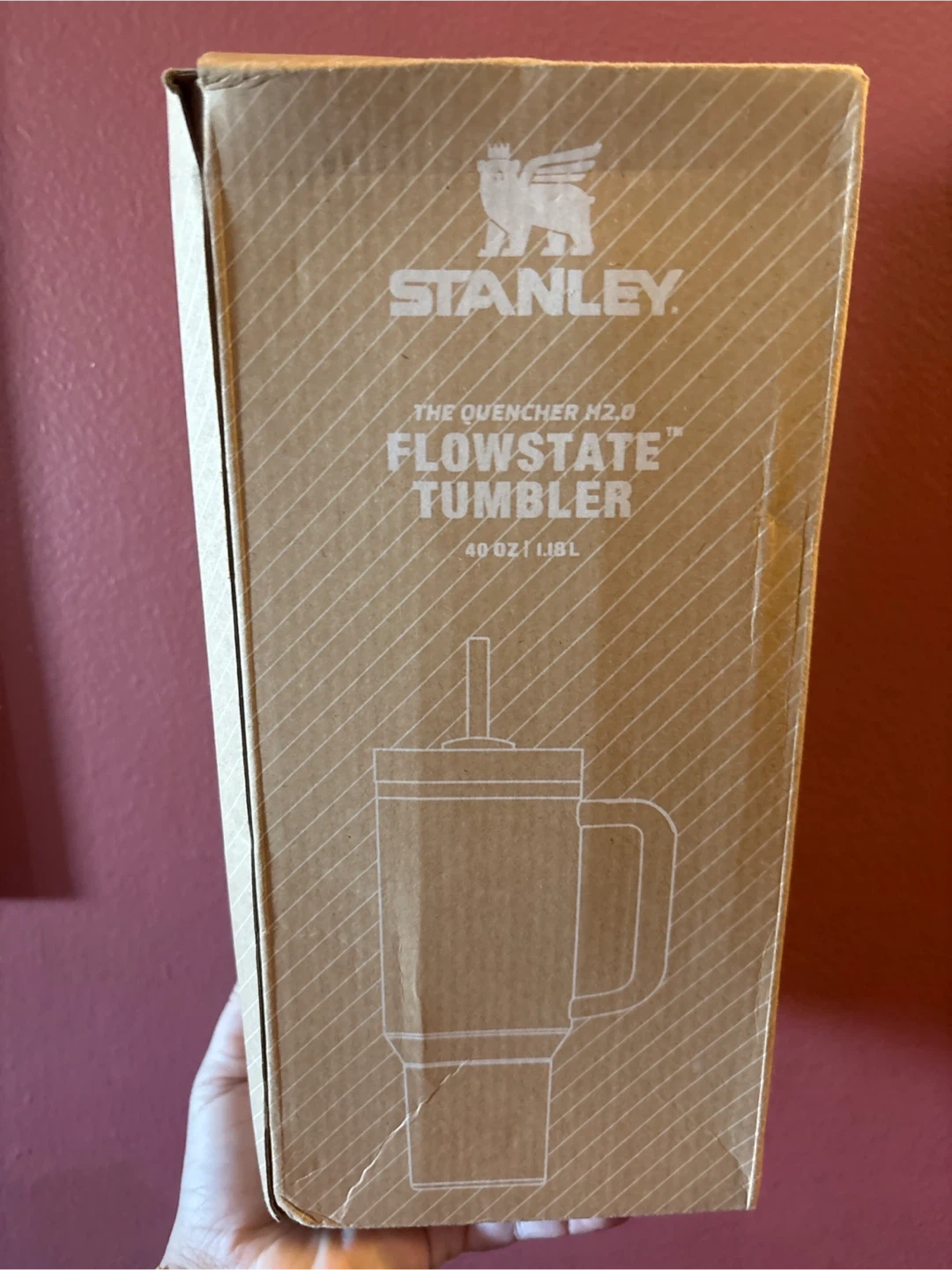 Stanley Flowstate Quencher H2.0 Tumbler. It's 40 oz or 1.18 liters. It's BPA-free and dishwasher safe. It features a handle and a splash-proof lid. New