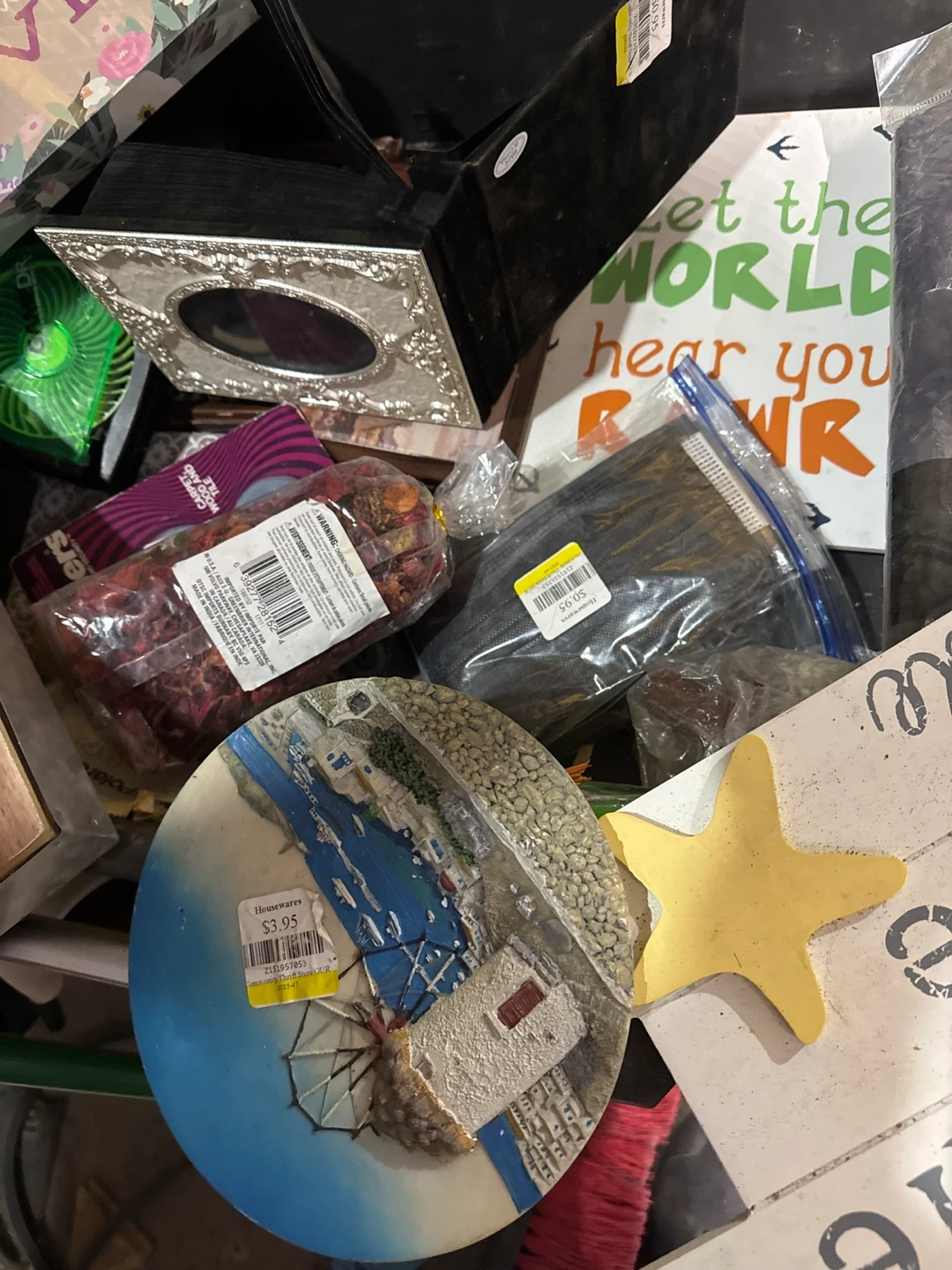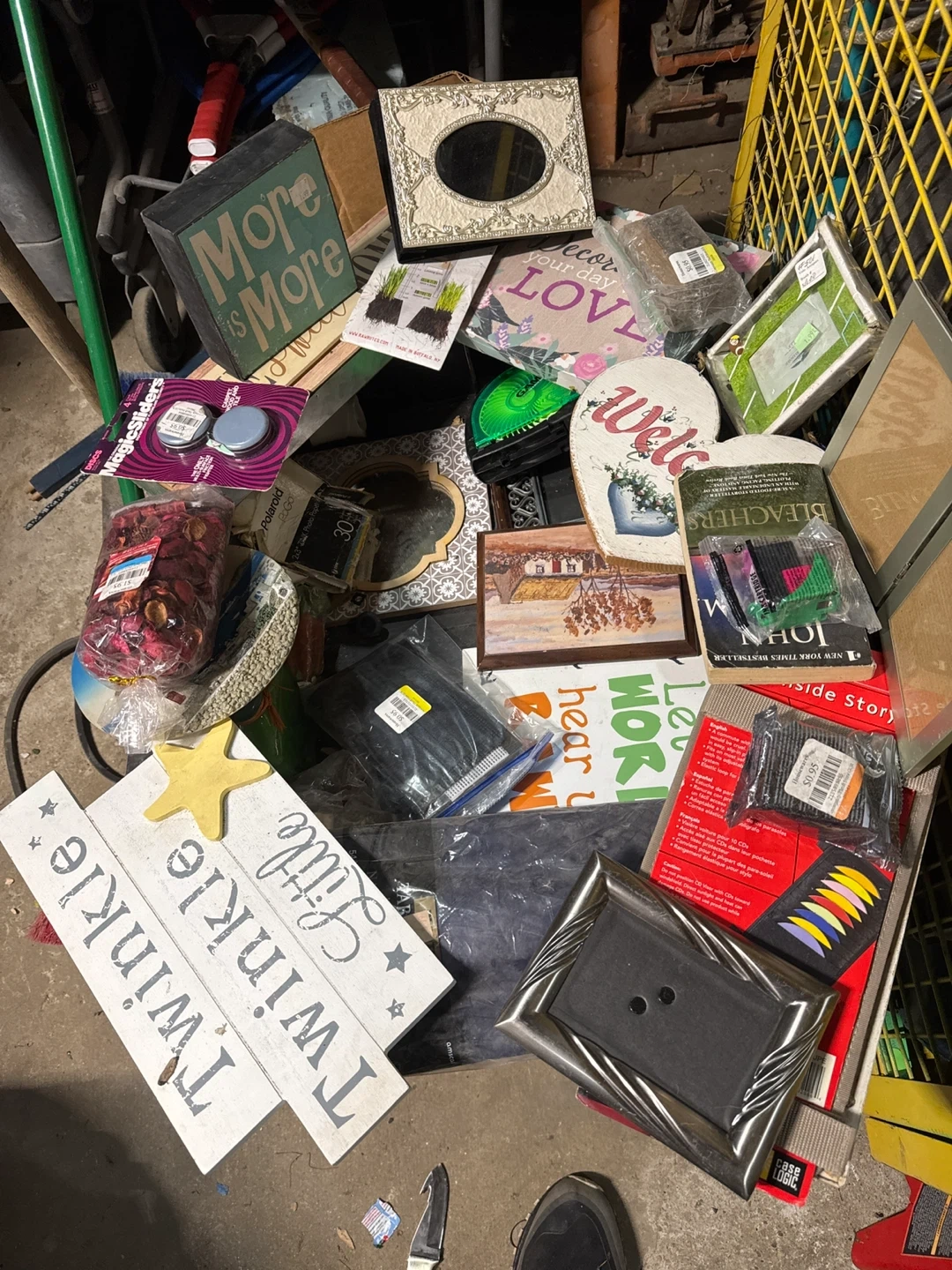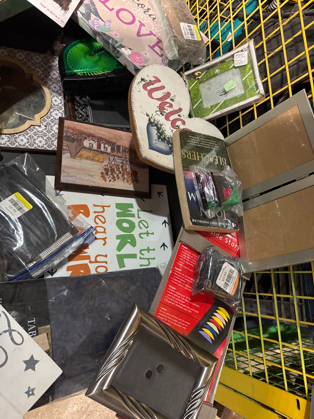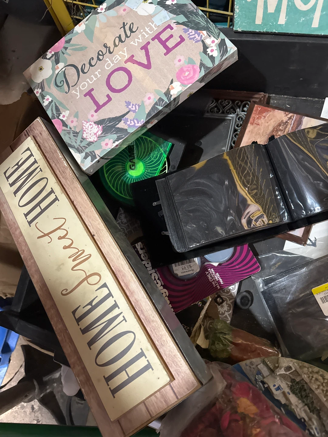 Decorative Wall Signs and Picture Frames This lot includes a 'Home Sweet Home' wood sign, a 'Decorate your day with LOVE' sign, and several picture frames. Also included are decorative plates and other home decor items. Items vary in size and material. 32 items.