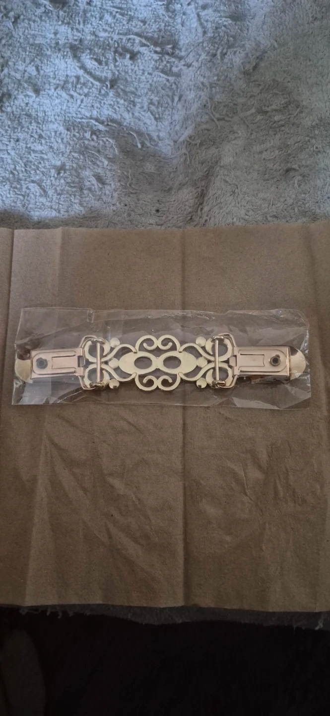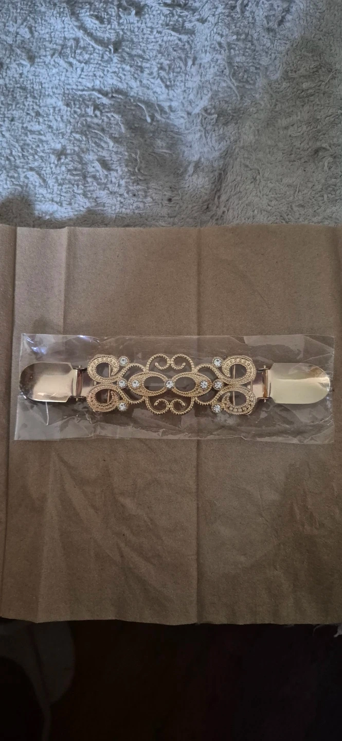 Add a touch of elegance to your outfit with this decorative gold-toned sweater clip. It features an ornate design with sparkling rhinestone accents. Easy to attach and remove, it secures cardigans or shawls stylishly. The clip measures about 13cm in length.