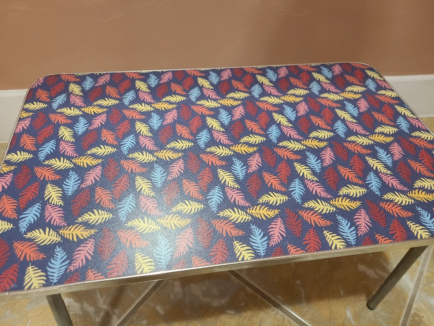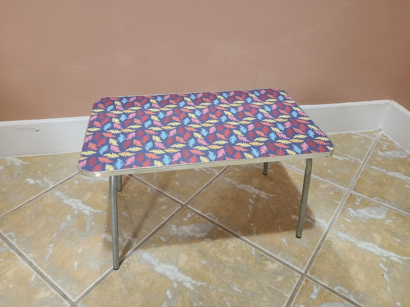 This folding lap desk has a colourful leaf pattern on top and its legs fold flat for easy storage.