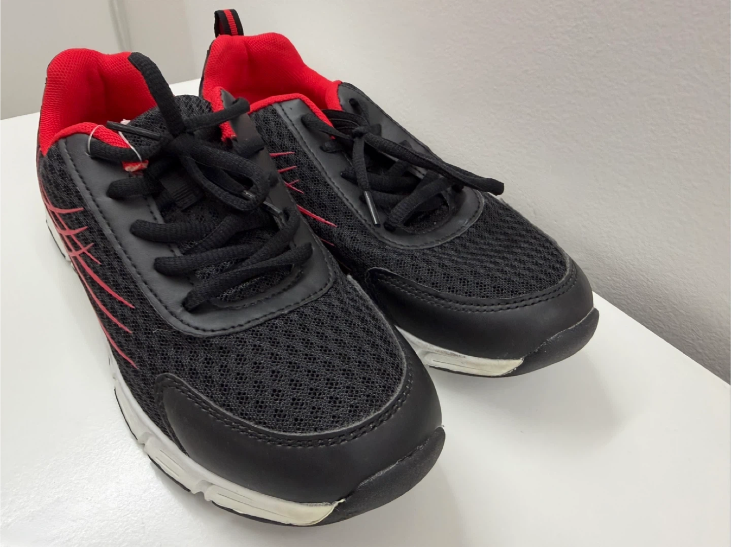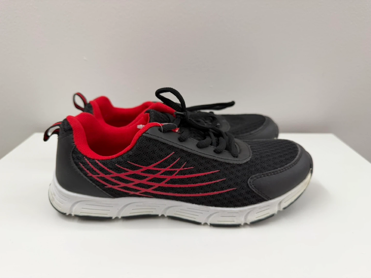 Comfortable black athletic shoes with red accents. Lace-up closure. Mesh and synthetic upper. Suitable for everyday wear or light sports activities.
