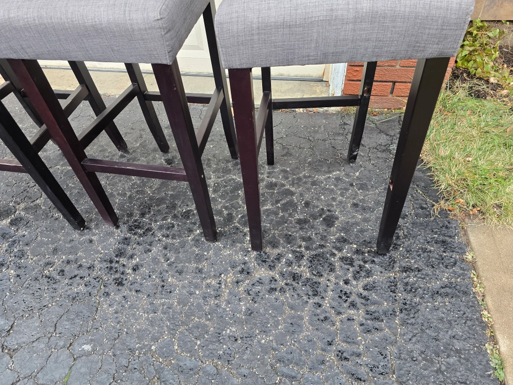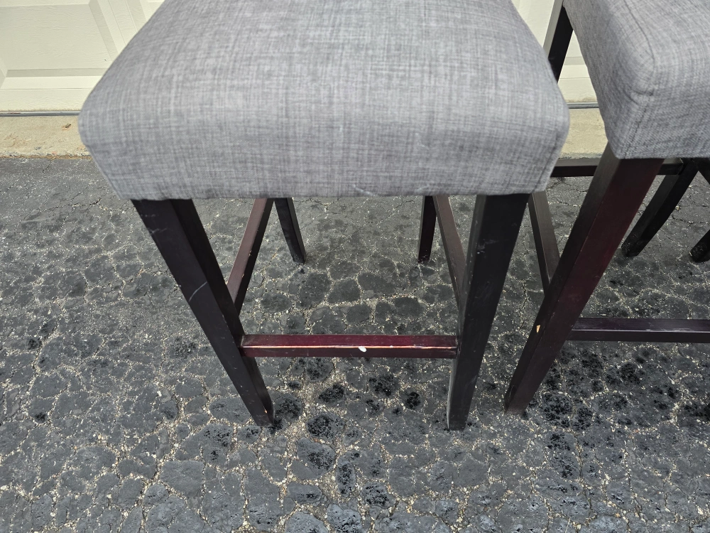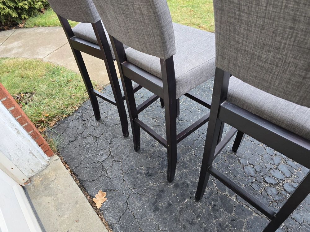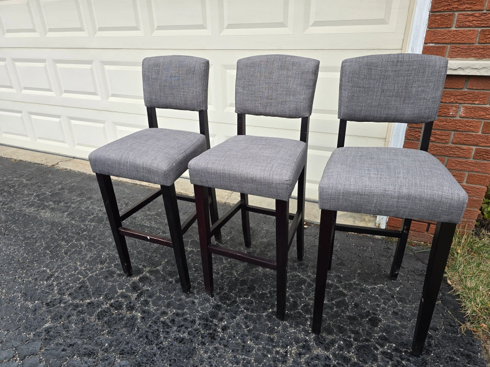 Set of three bar stools. Grey fabric seats selling for $30 each obo. one stool is missing foot rest as shown in pic. pick up in Scarborough.