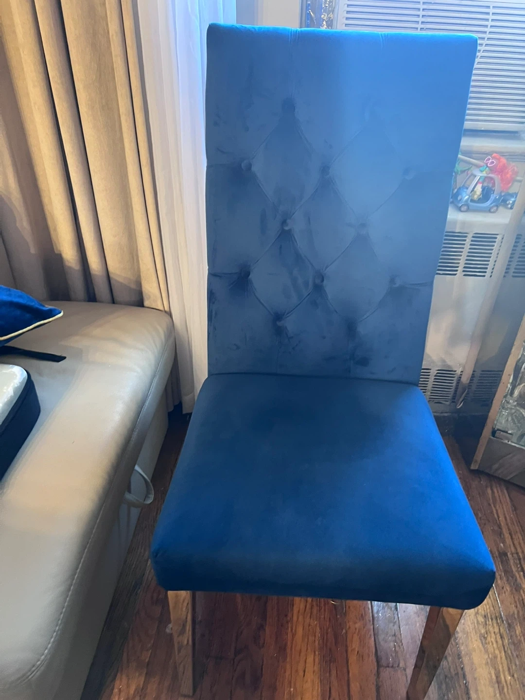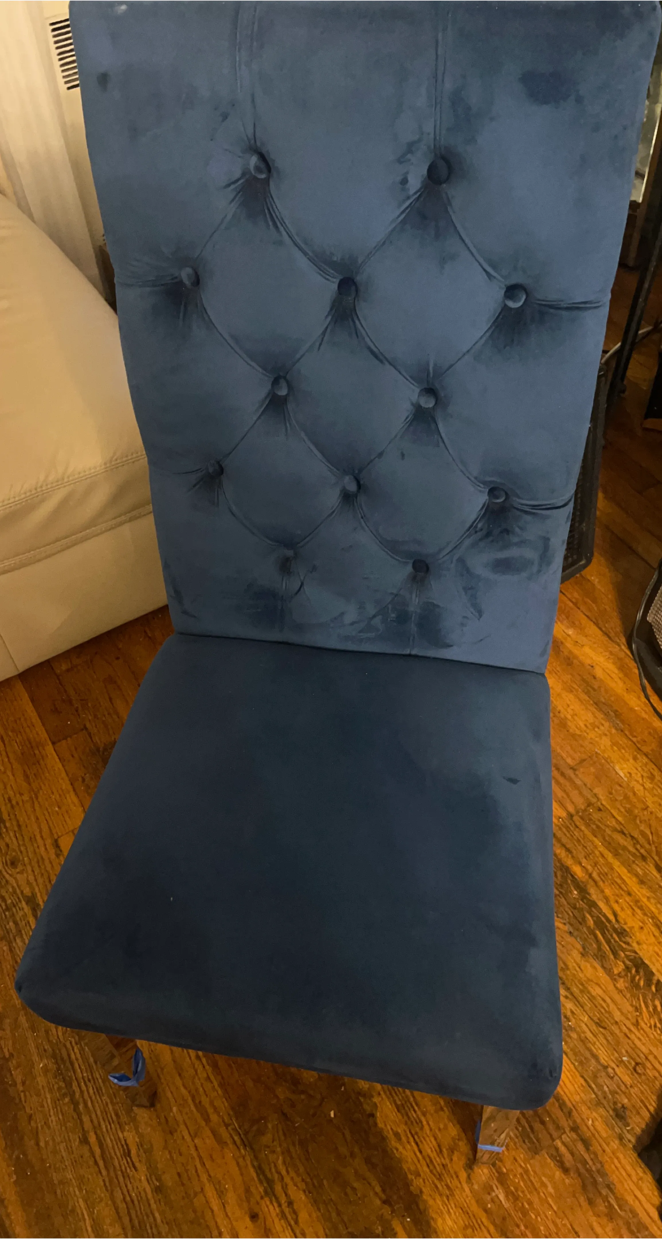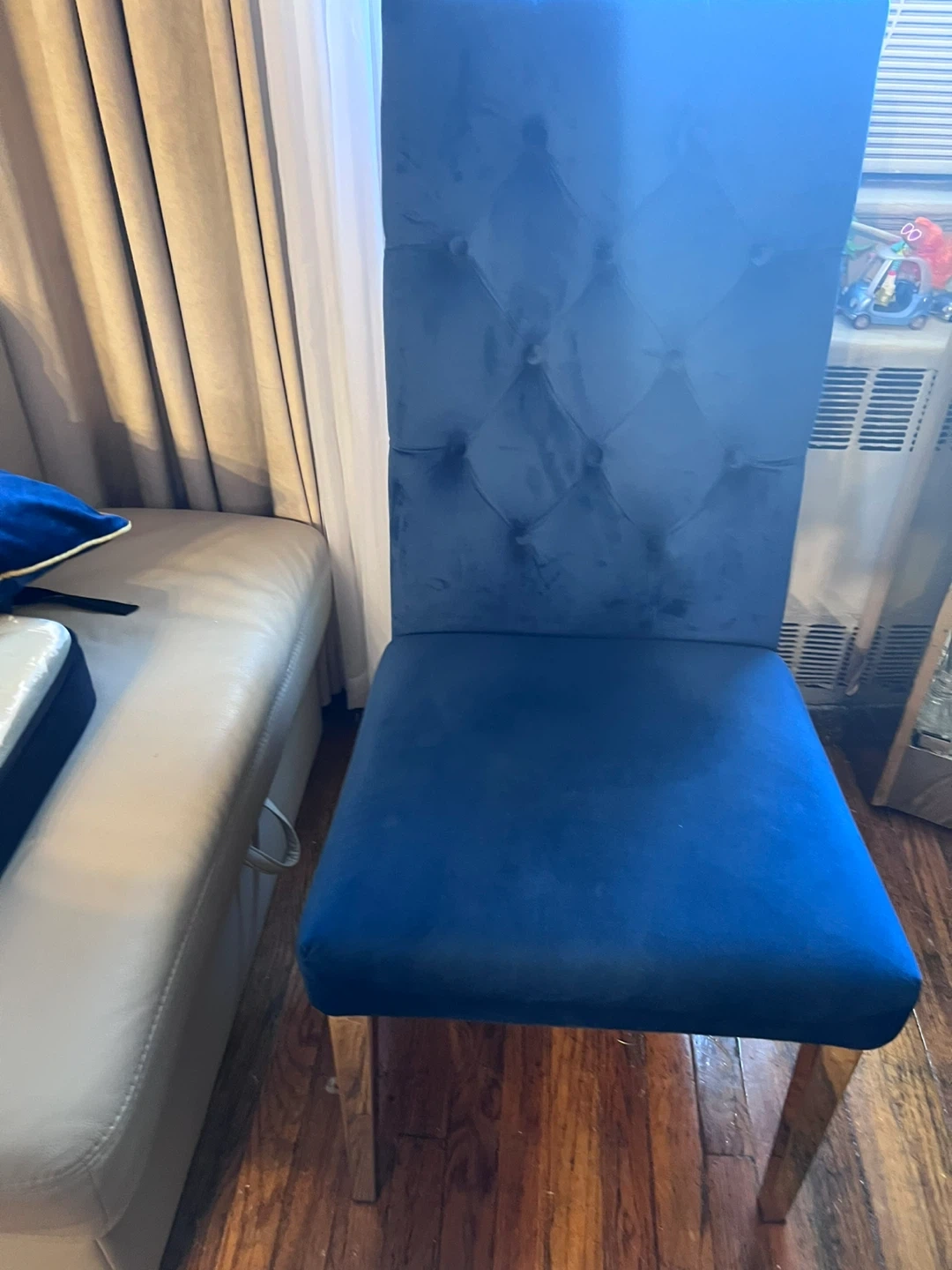 A dark blue velvet dining chair with tufted detailing on the back. It features a high back and a comfortable seat. Legs are chrome. 2 left asking 120. For the set.