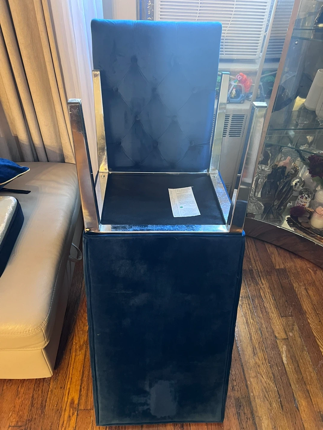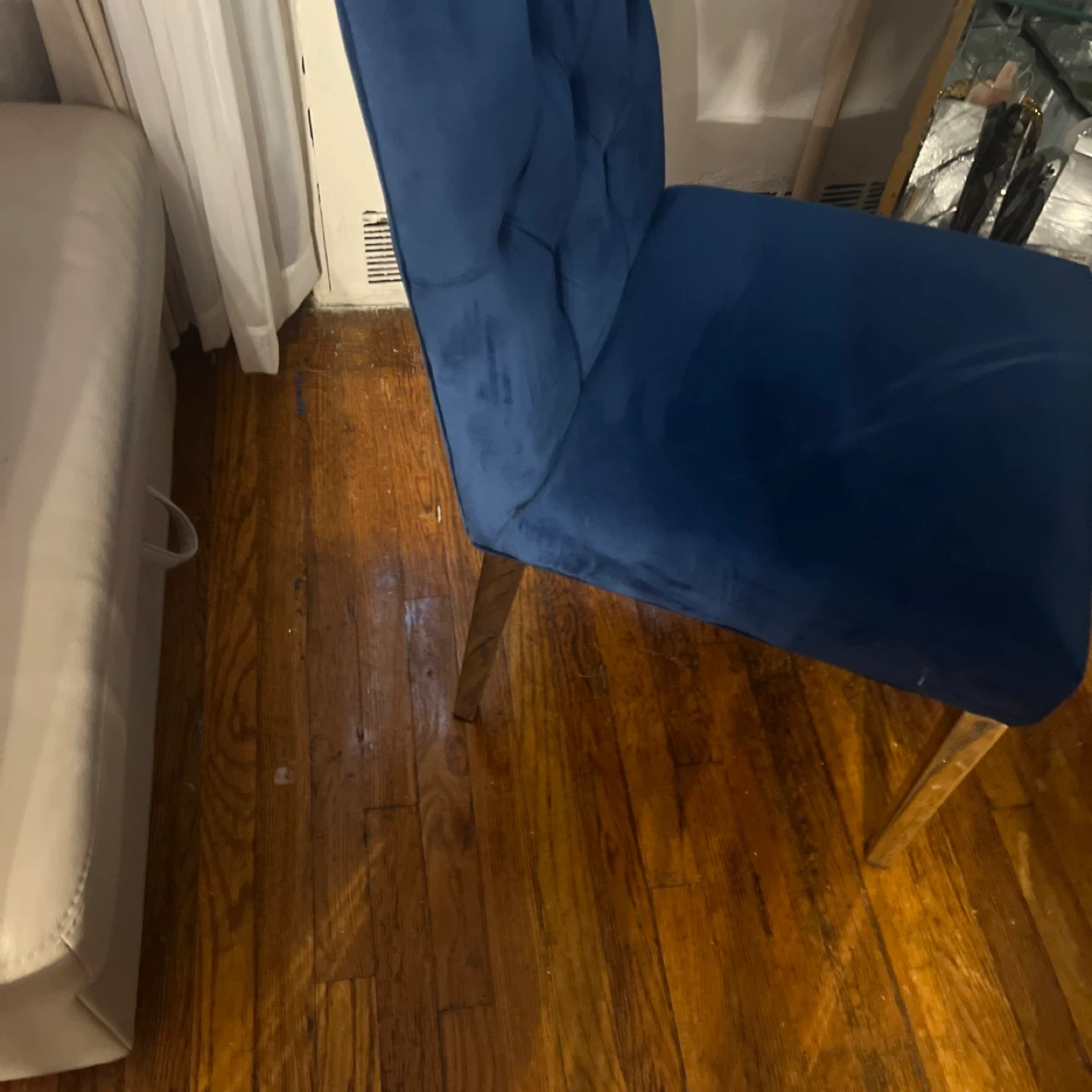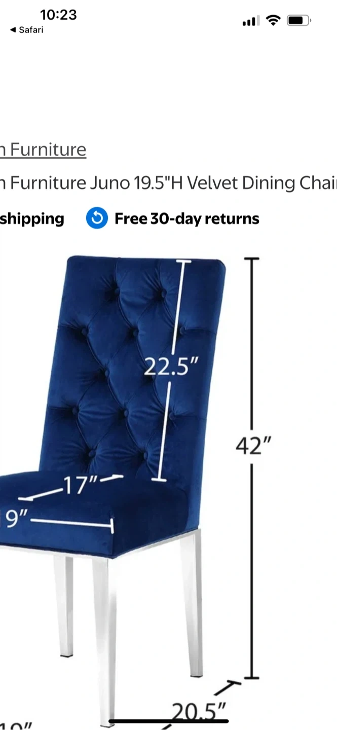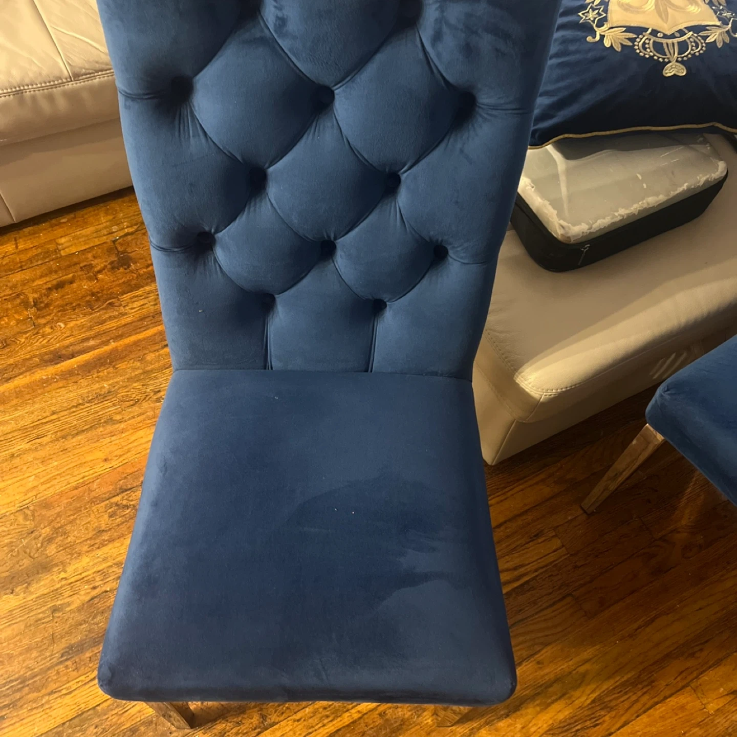 A dark blue velvet dining chair with tufted detailing on the back. It features a high back and a comfortable seat. Legs are chrome. 2 left asking 120. For the set.