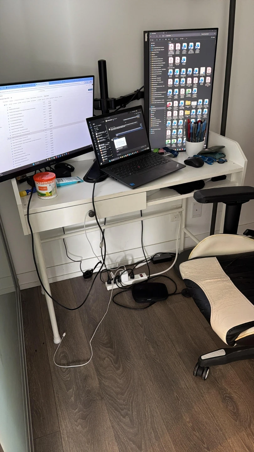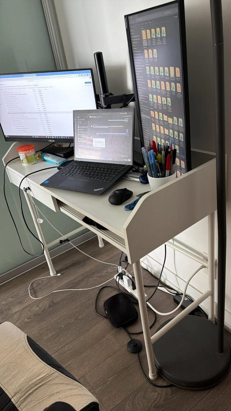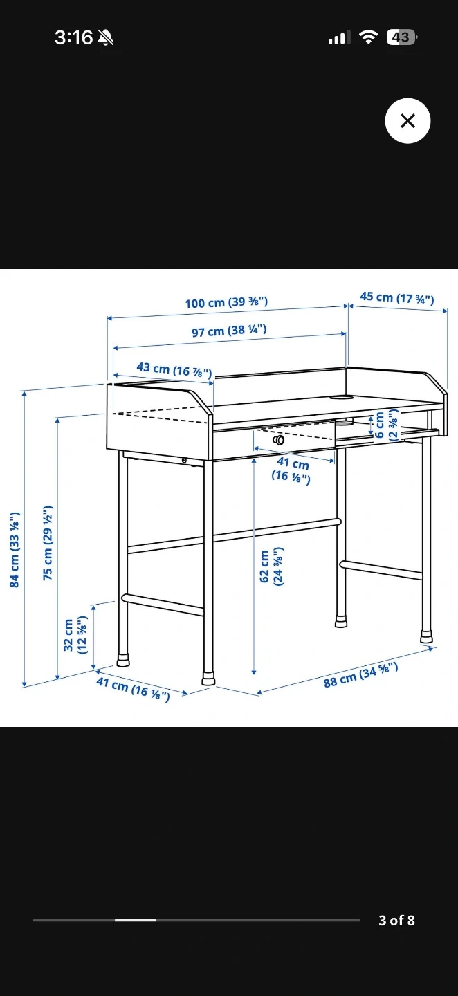 White MICKE desk from IKEA. It's 100 cm wide and 75 cm tall. The desk has a small drawer for storage. It's a handy size for smaller spaces.