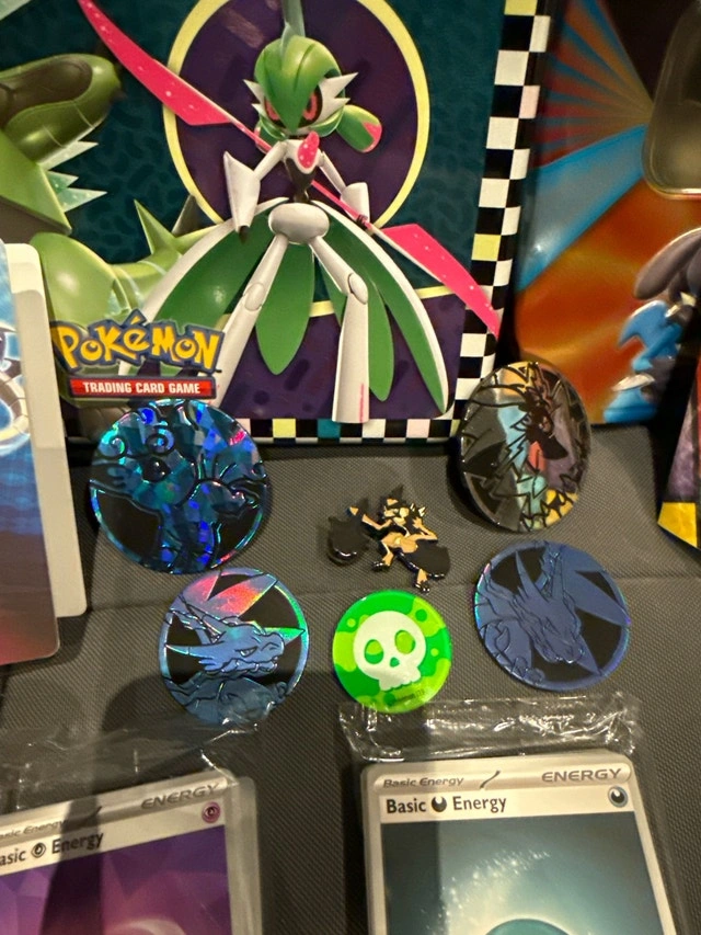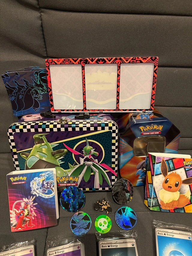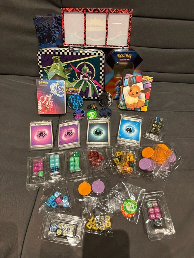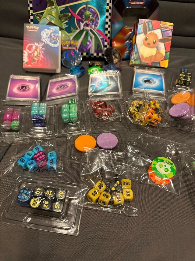 Enhance your Pokémon Trading Card Game experience with this collection of accessories! This lot includes a variety of items to keep your cards and gameplay organized. The items are in perfect condition, functional for gameplay. Included are: Assorted dice, various coins, 240 Energy cards, sleeves, tins, and a pin. Let me know if you're interested!
