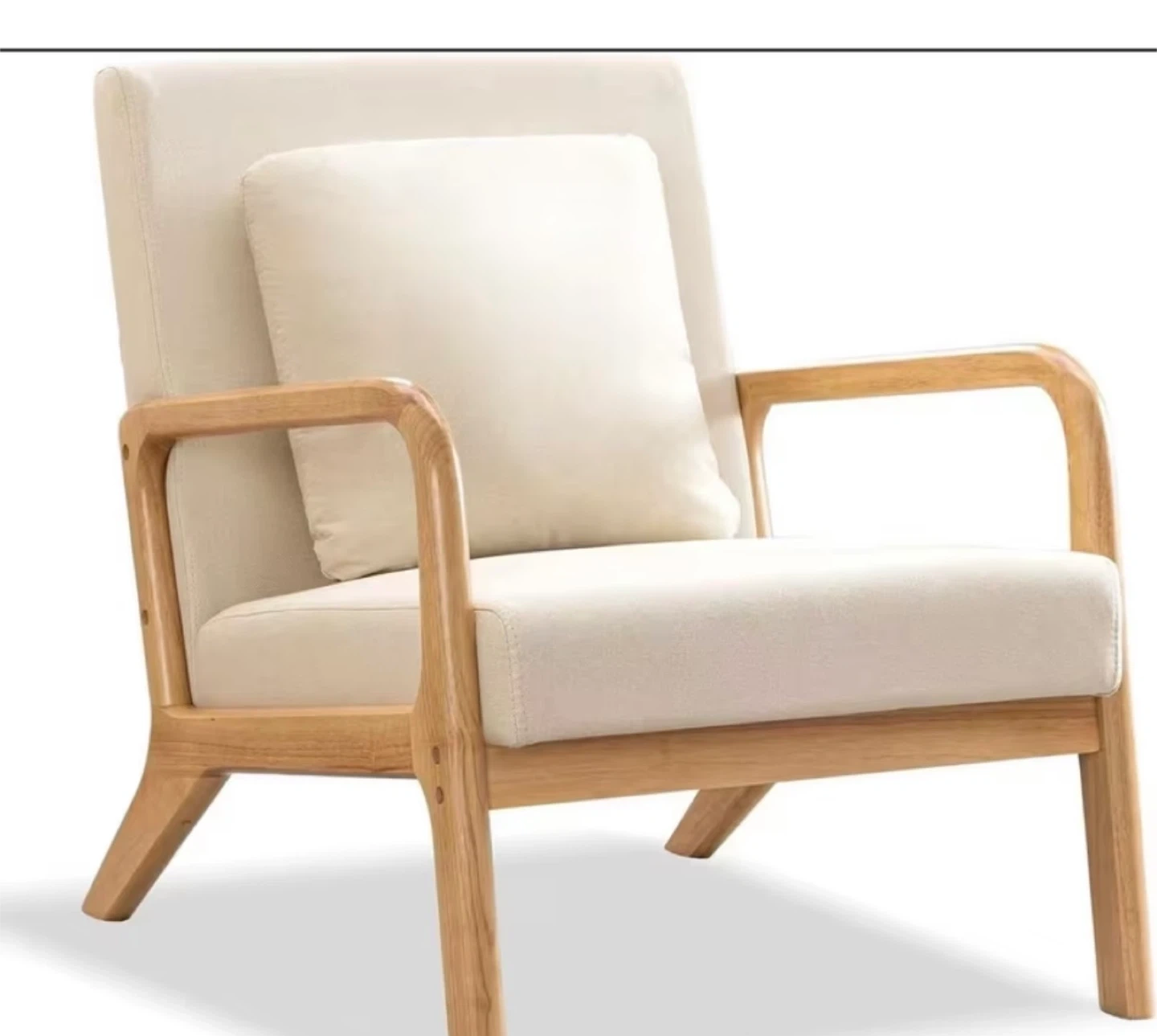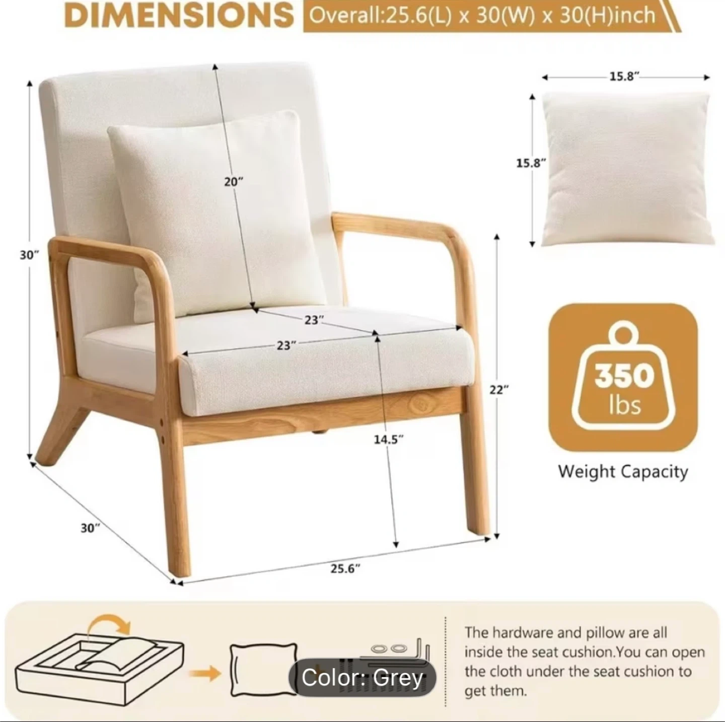 Comfortable accent chair in a neutral beige fabric. Includes a matching throw pillow for extra coziness. Solid wood frame and legs. Weight capacity is 350 lbs.