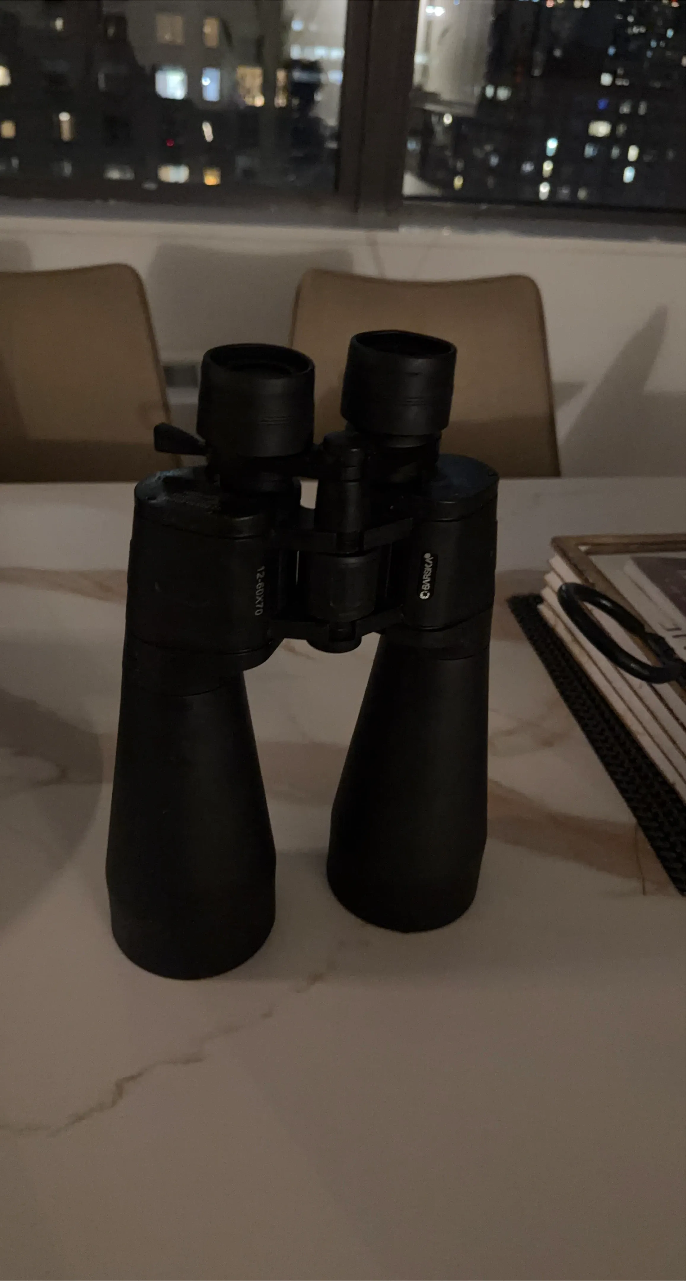 Barska 12-60x70 binoculars in black. These are binoculars with a large objective lens diameter. They're good for long-distance viewing.
