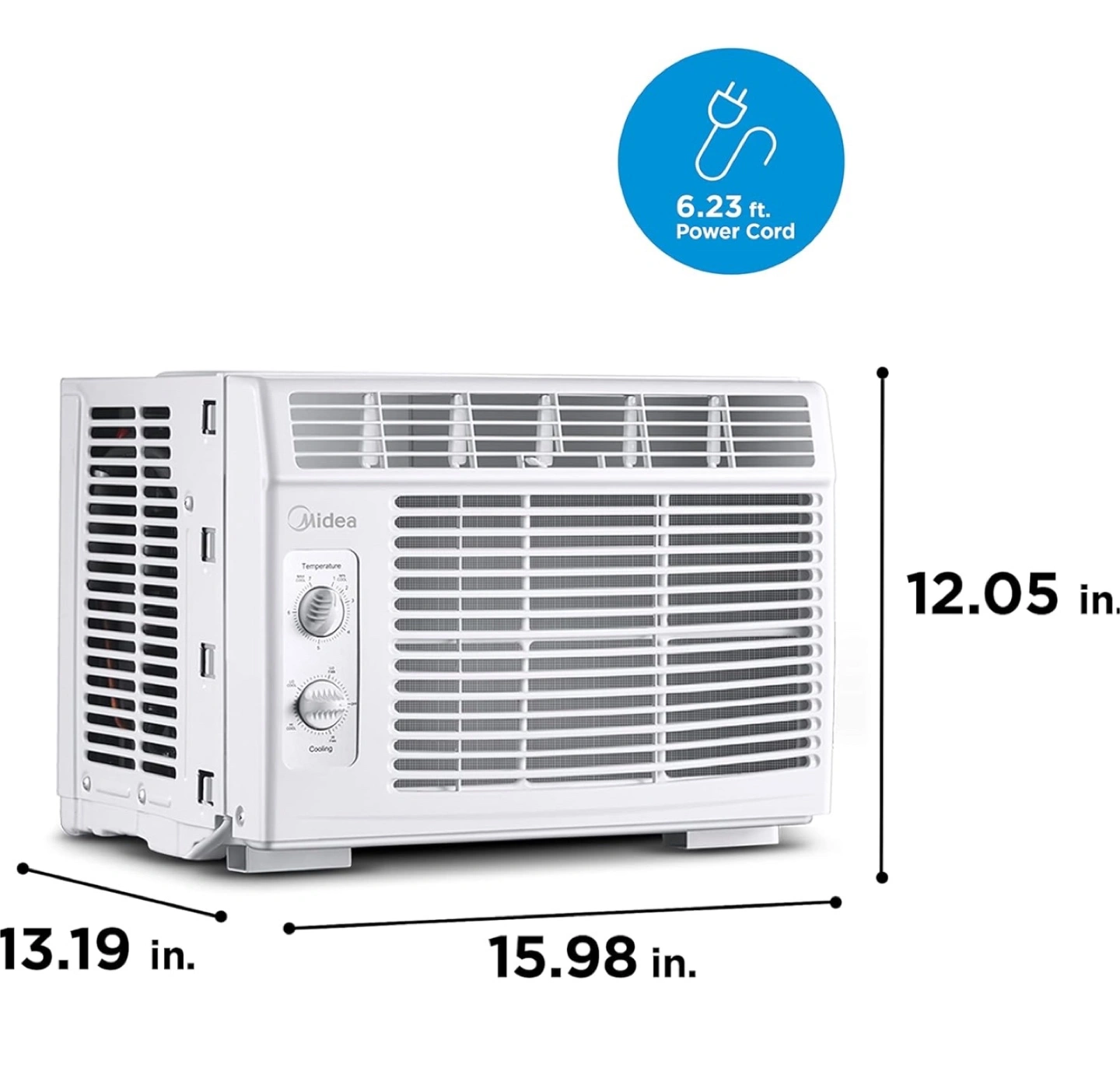 5000 BTU window air conditioner. Easy to use controls. Washable filter. Two fan speeds and two cooling modes. 6.23-foot power cord. Measures approximately 13.19" x 15.98" x 12.05".