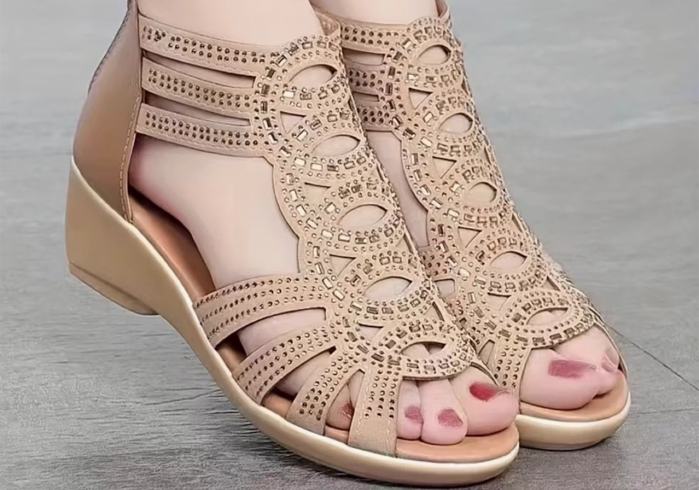 Comfortable and stylish gladiator wedge sandals. Open toe design with a convenient back zipper. Decorated with rhinestones for a touch of sparkle!