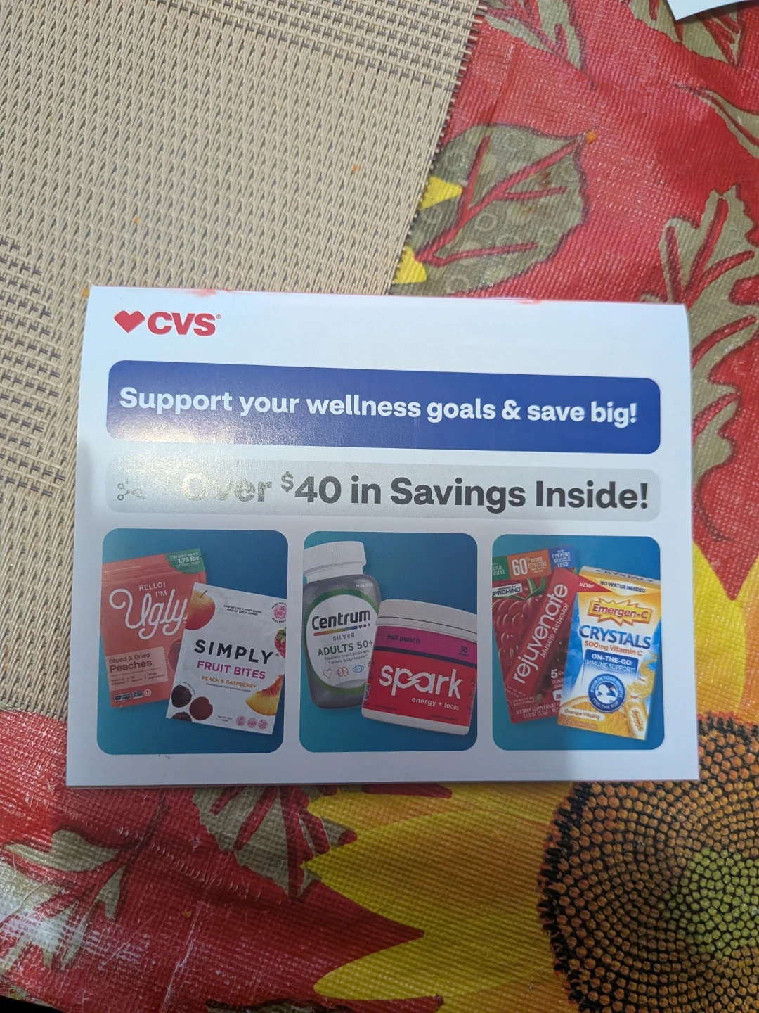 This is a CVS coupon booklet offering over $40 in savings. It includes coupons for Centrum vitamins, Emergen-C Crystals, and other wellness products. Coupons are valid through 2/28/26. Redeemable at CVS!