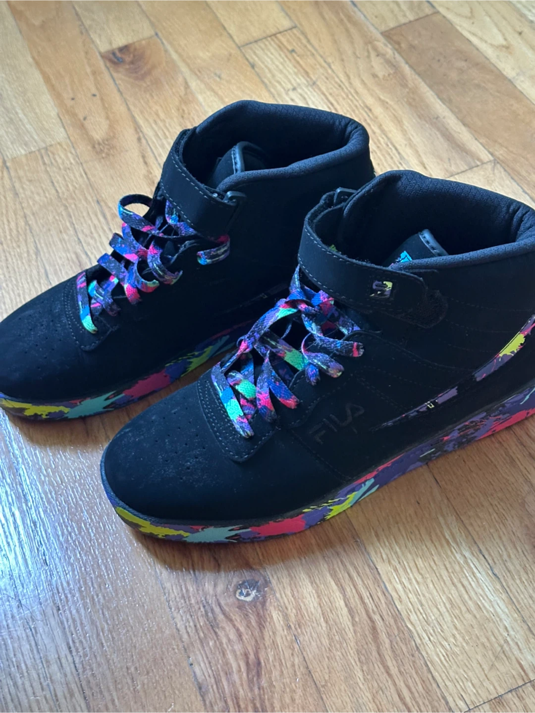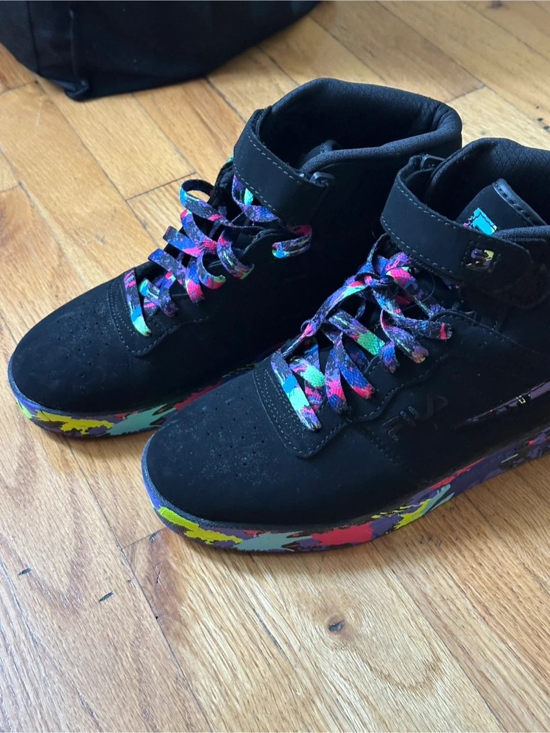 These FILA mid-top sneakers are black with vibrant, multi-colored accents on the soles and laces. They feature a hook-and-loop strap closure at the ankle for a secure fit. Suede-like material on the exterior.