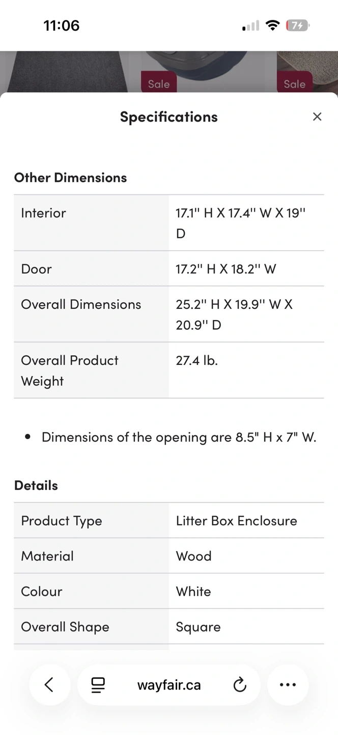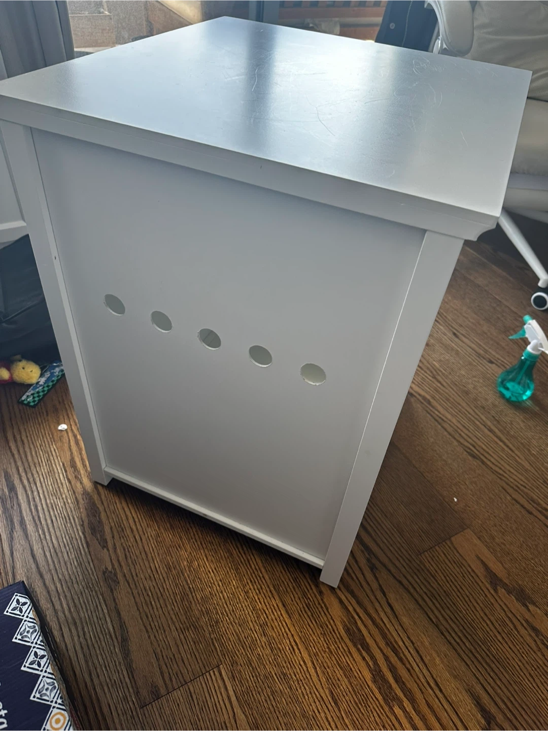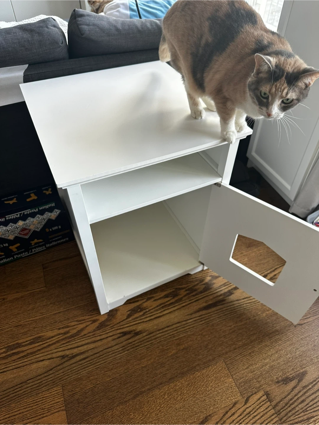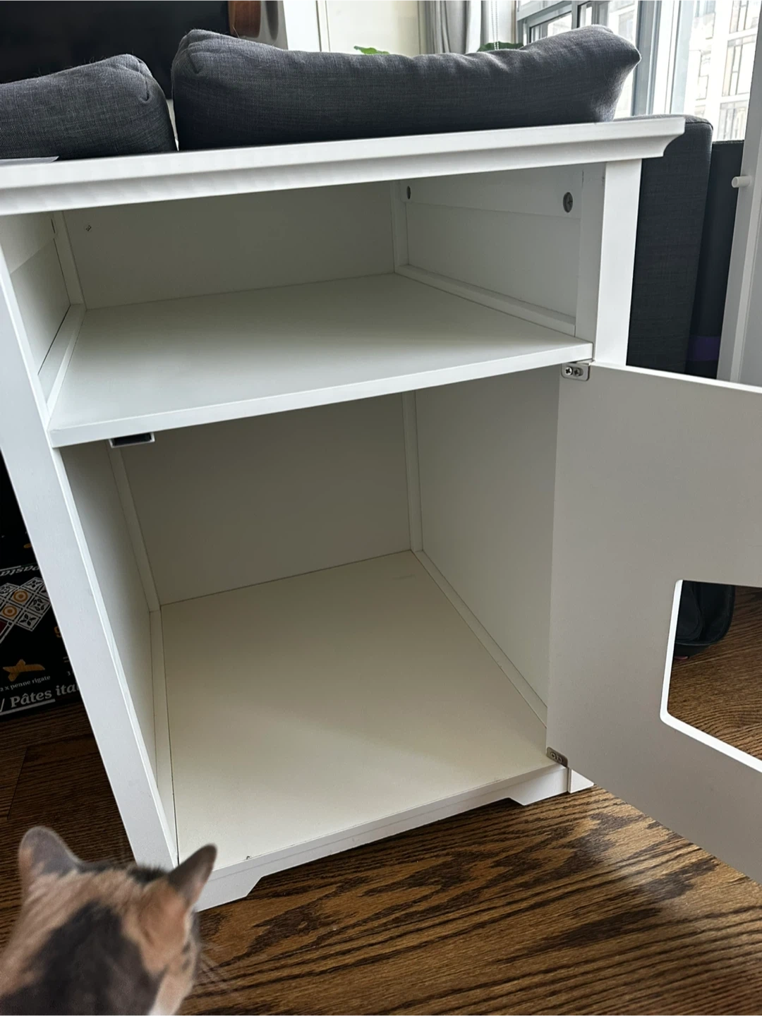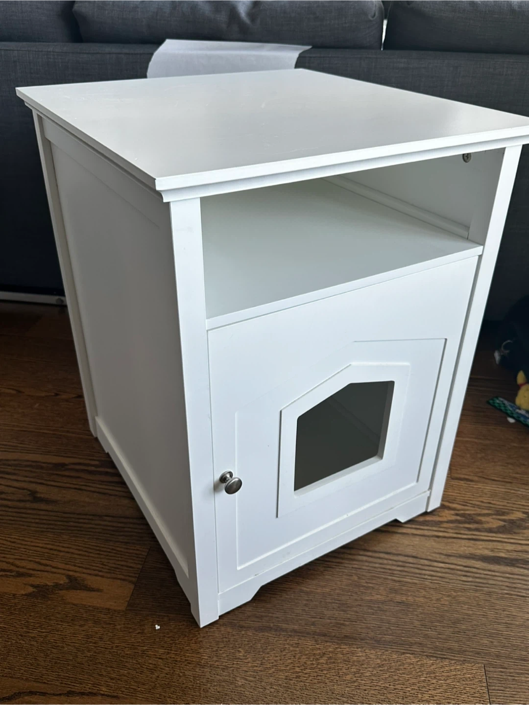This is a white cabinet designed to enclose a pet's litter box. It features a shelf above the enclosed space and ventilation holes on the back. The front has a door with an arched opening for your pet.