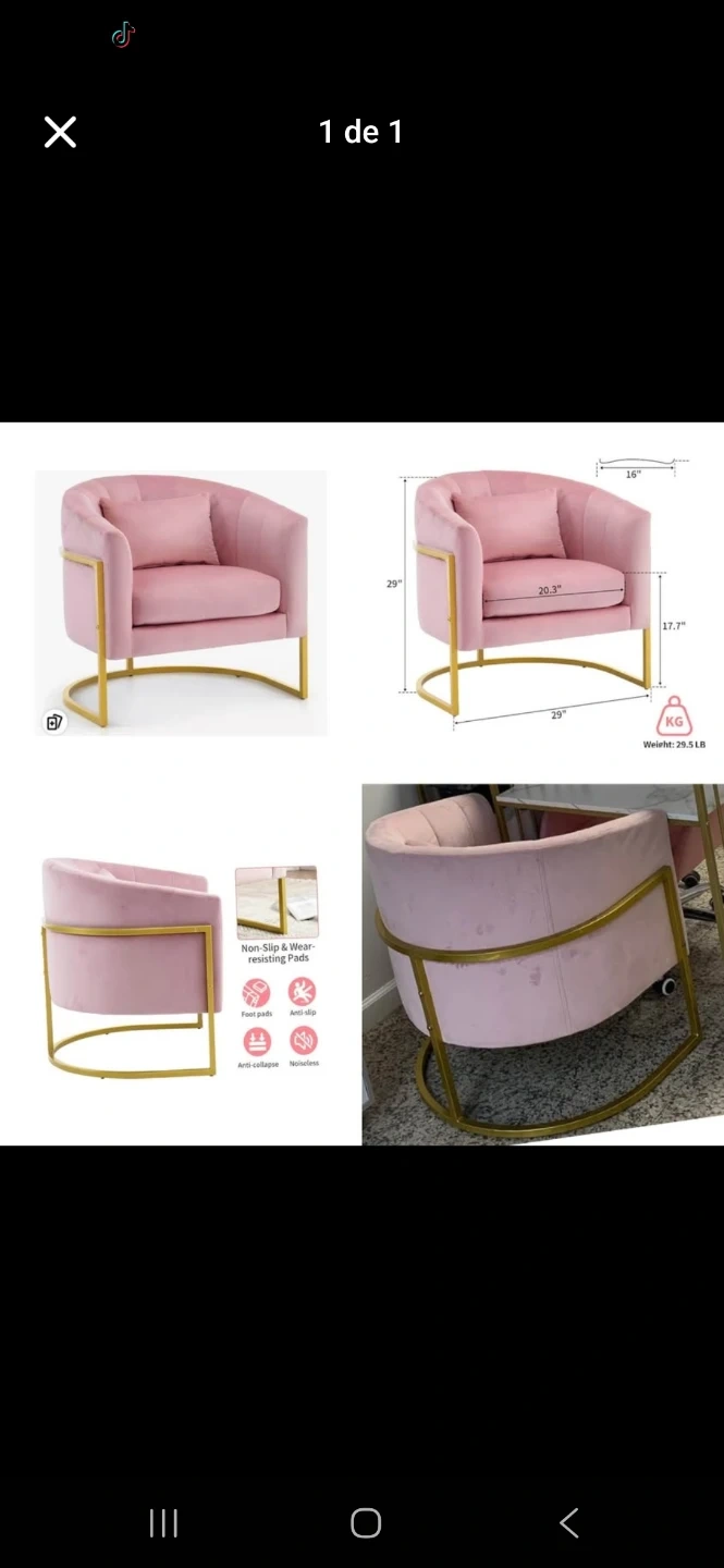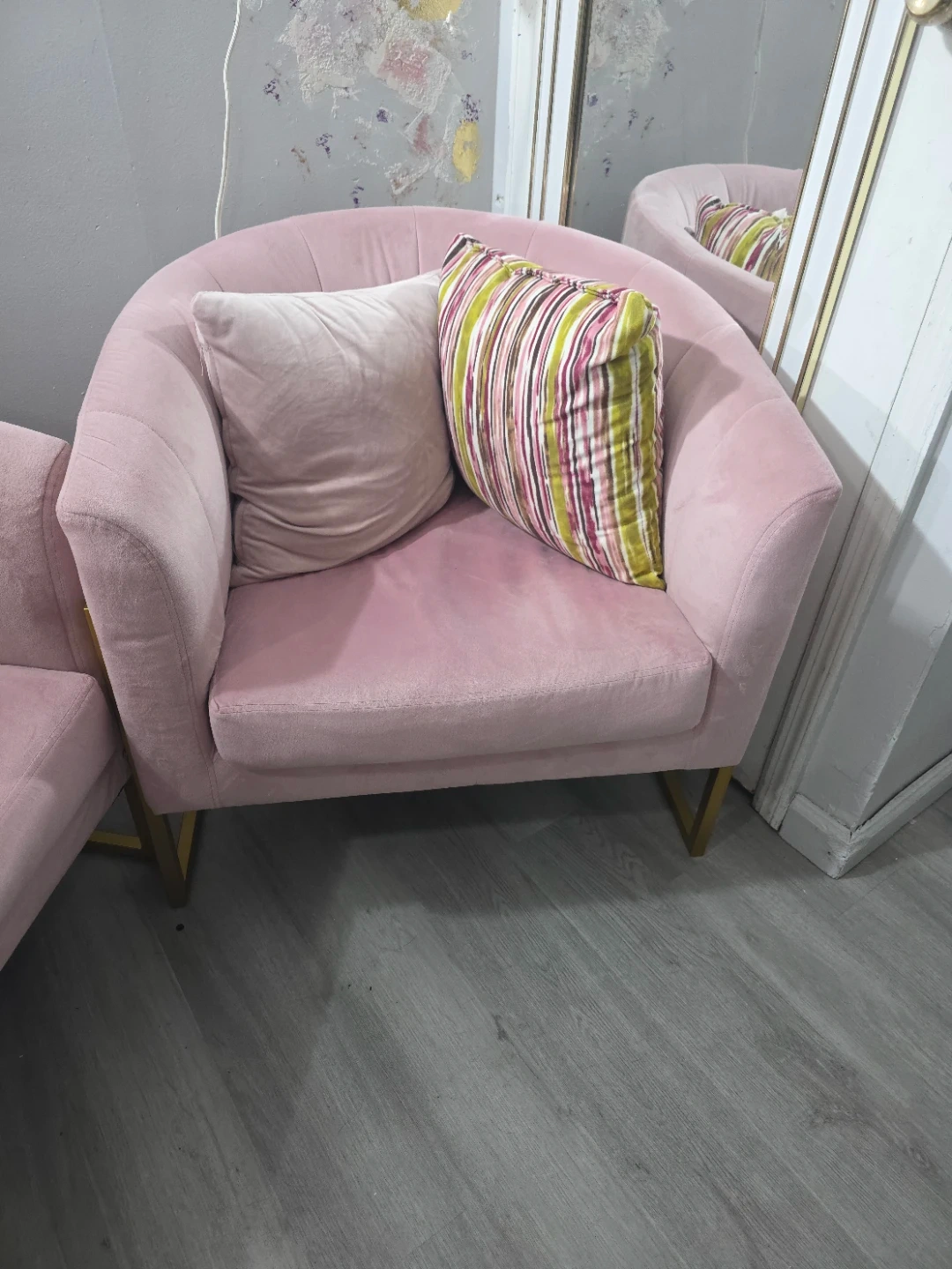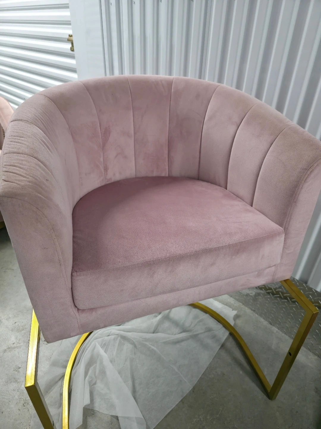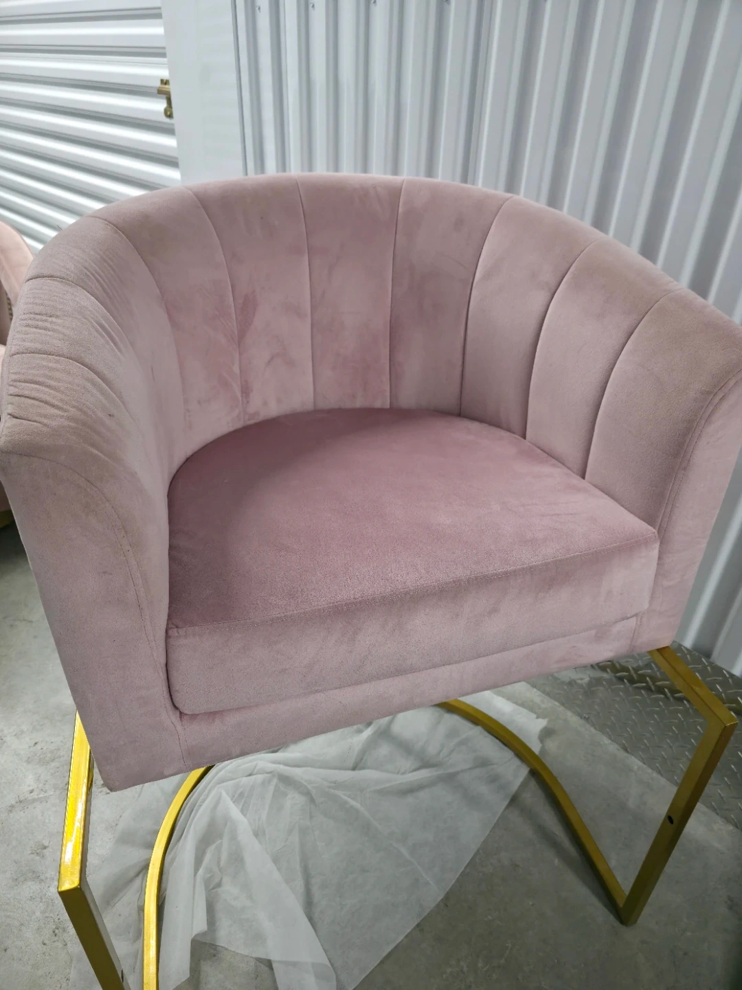 This stylish accent chair features plush pink velvet upholstery and a sleek gold metal base. Its curved back and channeled design offer a comfortable and chic seating option. Includes non-slip, wear-resisting pads on the base. Overall dimensions: 29" H x 20.5" W x 17.7" D.