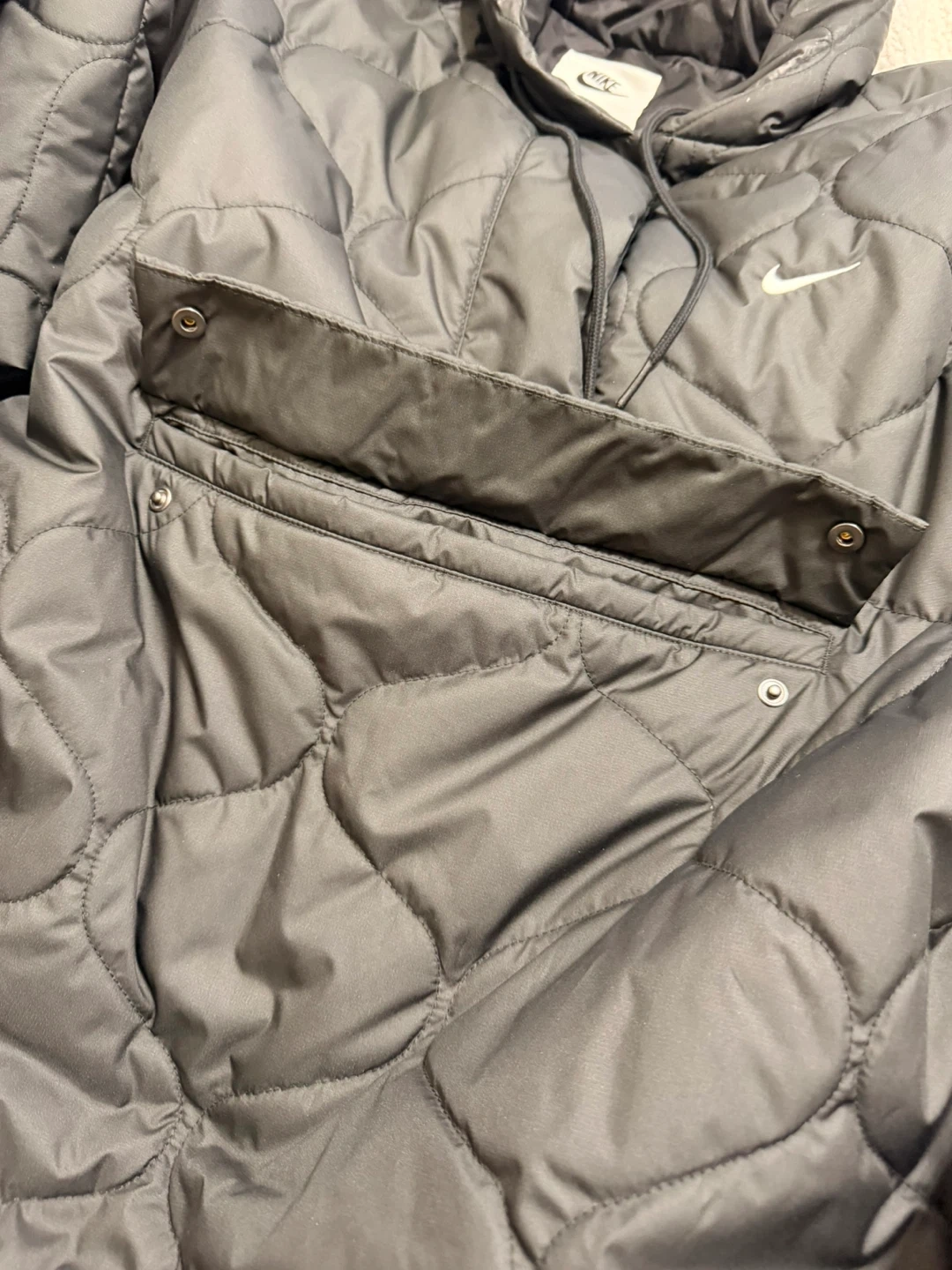 This is a Nike quilted pullover hoodie jacket. It's black and features a front pouch pocket with snap closures. The jacket is made of nylon and polyester.