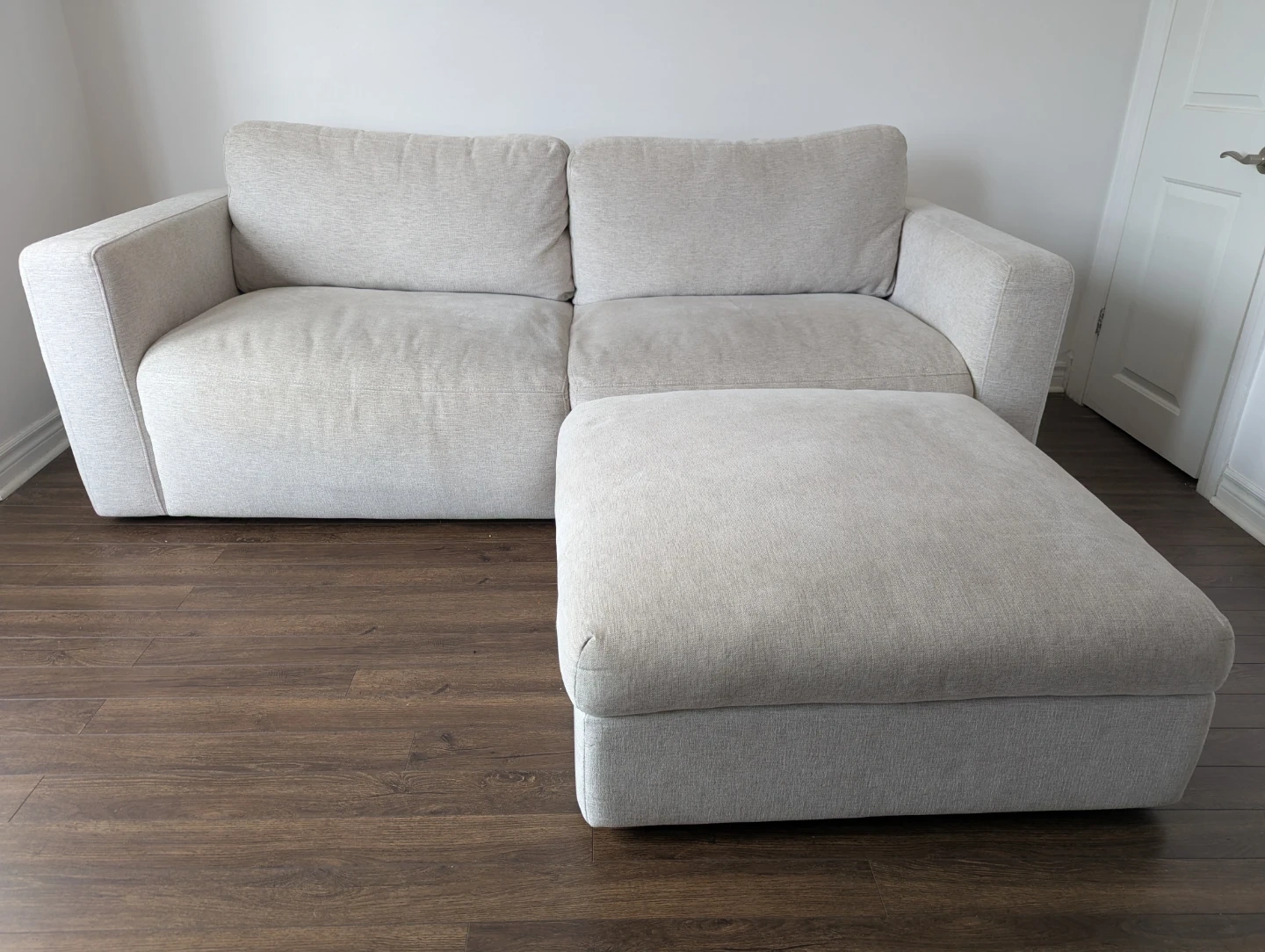 A comfy two-seater sofa with a matching ottoman, upholstered in a light neutral fabric. The sofa and ottoman are modular and can be arranged to suit your space. Moving out and can't take it with me. Pick up only.