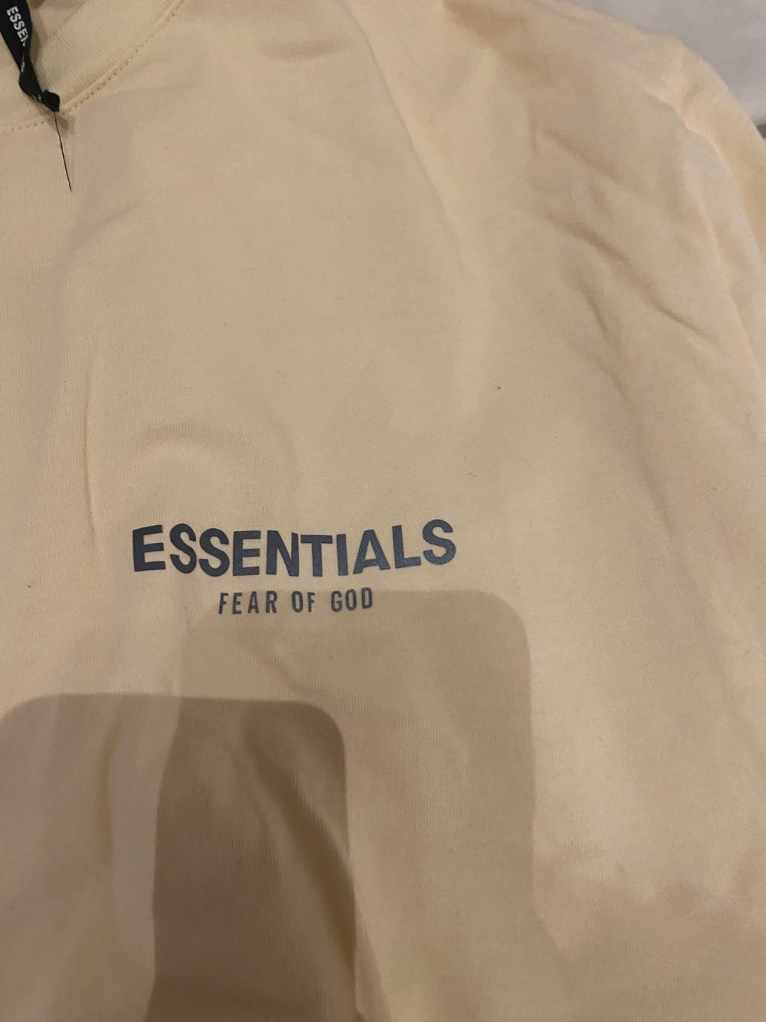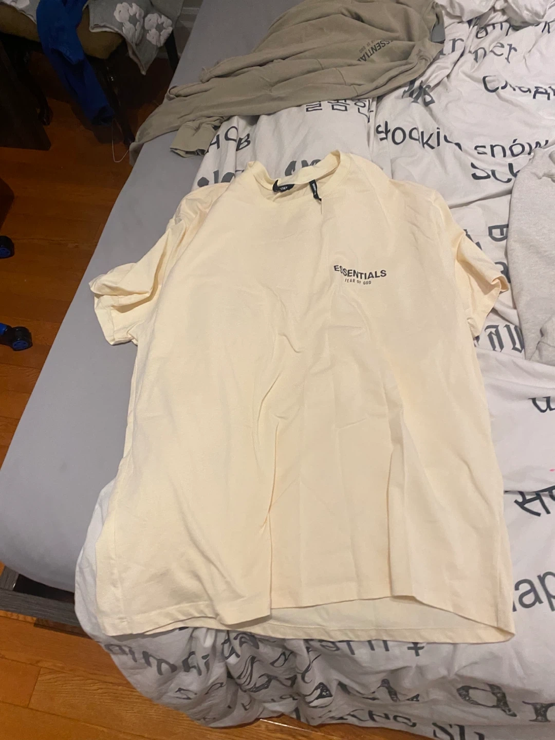 Cream coloured t-shirt from Fear of God Essentials. Short sleeves with a crew neckline. It has the Essentials logo printed on the chest.