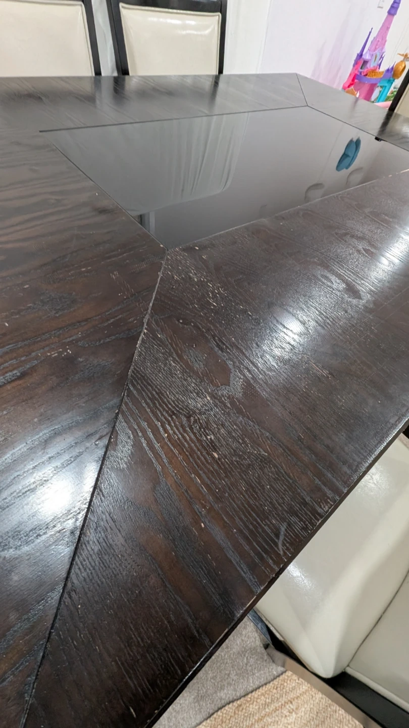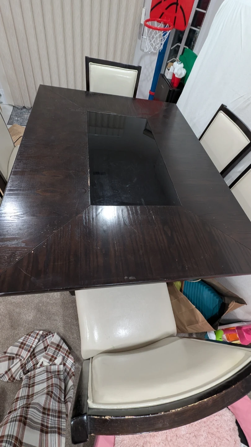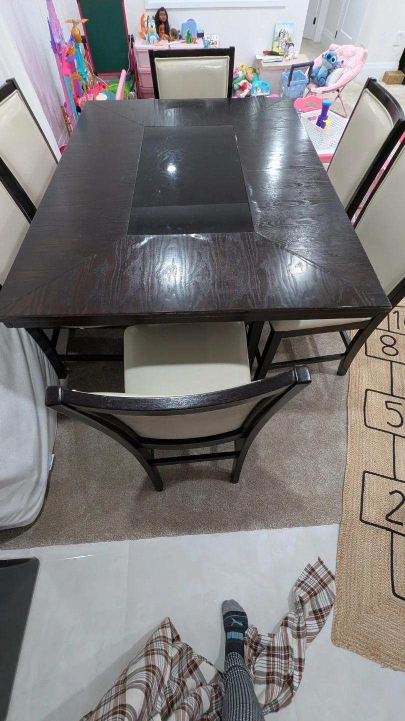 This dining table (bar hight) features a dark wood finish with a sleek black glass inlay. It comfortably seats six people. Perfect for family meals or entertaining guests! 4 Chairs in great condition, 2 chairs seat is having cracks, purchssed cover for them. Table have some scratches.