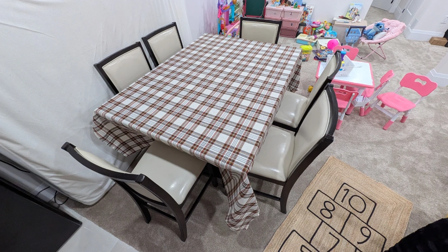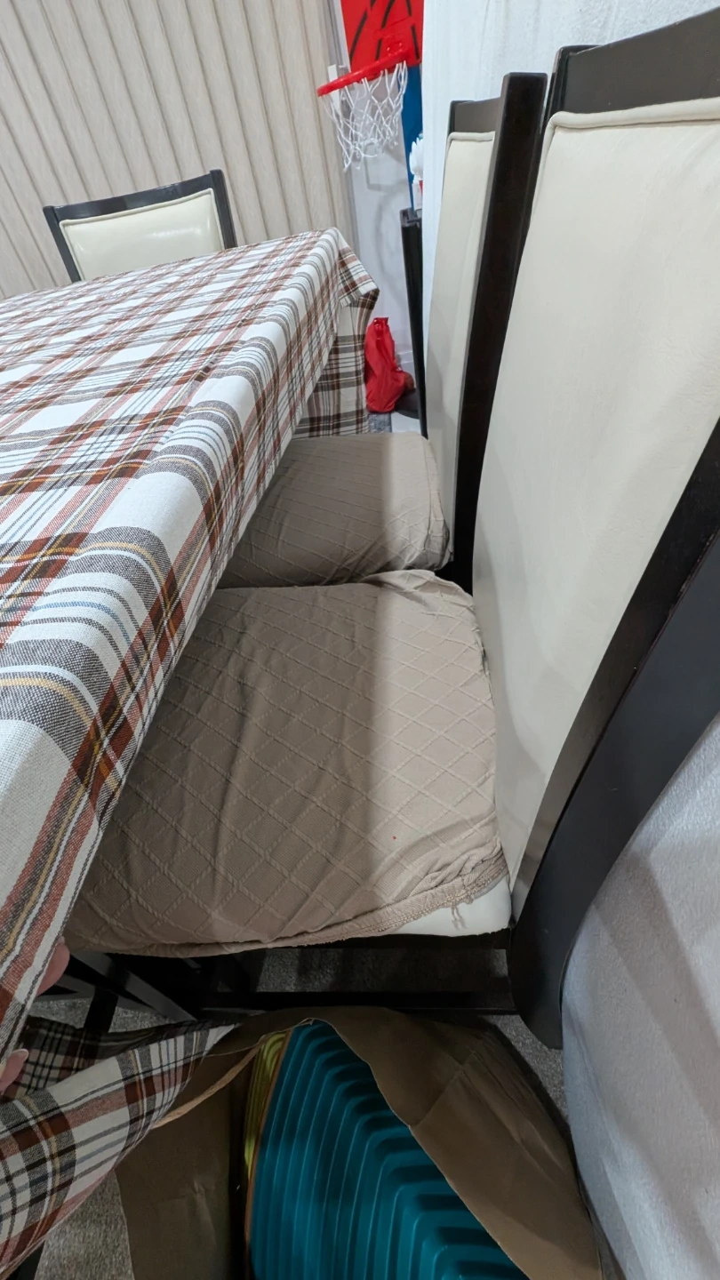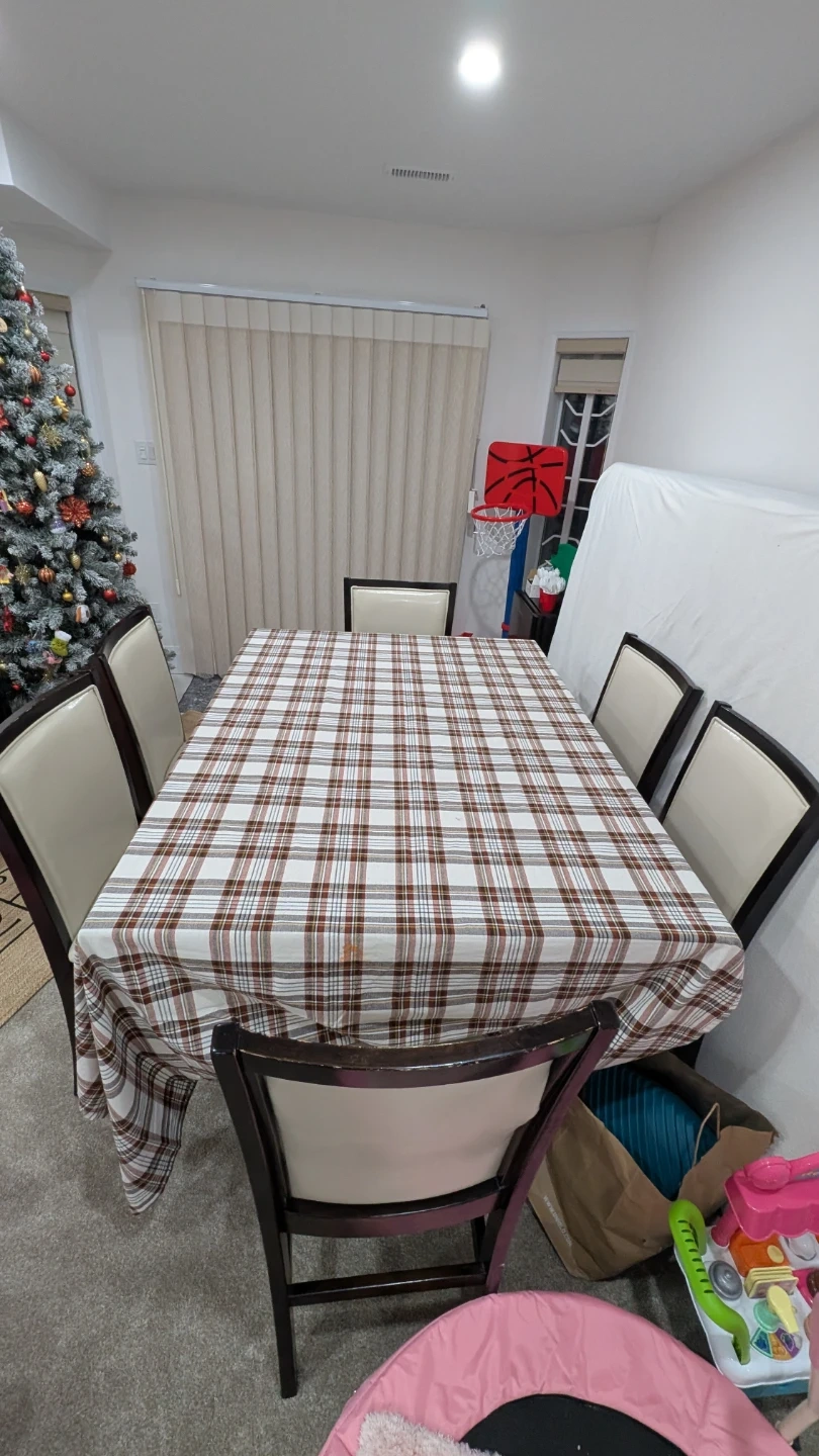 This dining table (bar hight) features a dark wood finish with a sleek black glass inlay. It comfortably seats six people. Perfect for family meals or entertaining guests! 4 Chairs in great condition, 2 chairs seat is having cracks, purchssed cover for them. Table have some scratches.