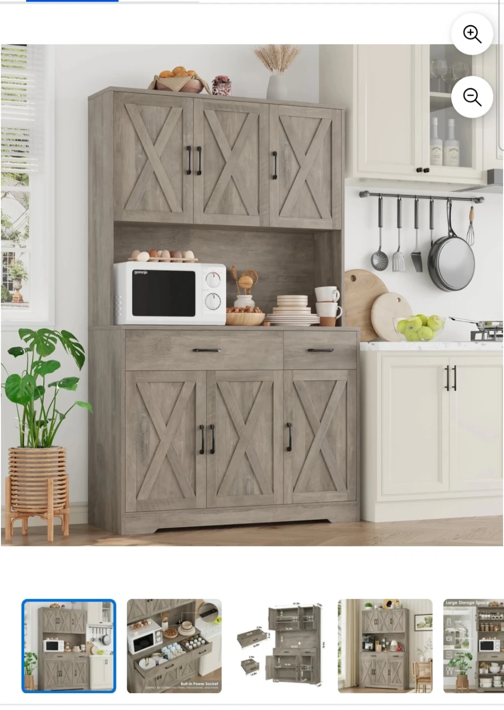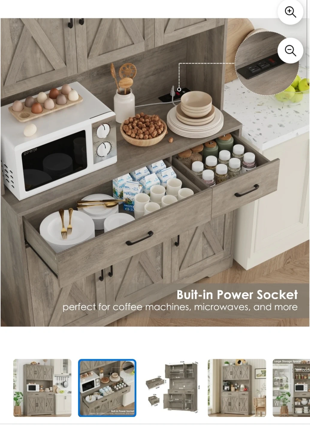 This kitchen pantry features a built-in power socket, perfect for coffee machines, microwaves, and more. It's constructed with adjustable shelves and a floor cabinet design. The wash gray finish complements modern kitchens.