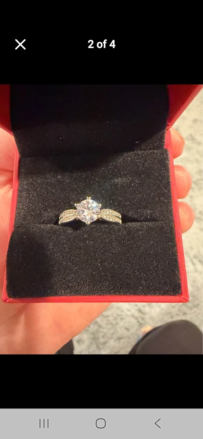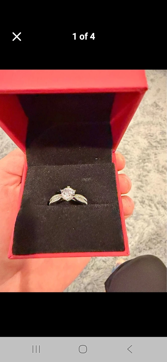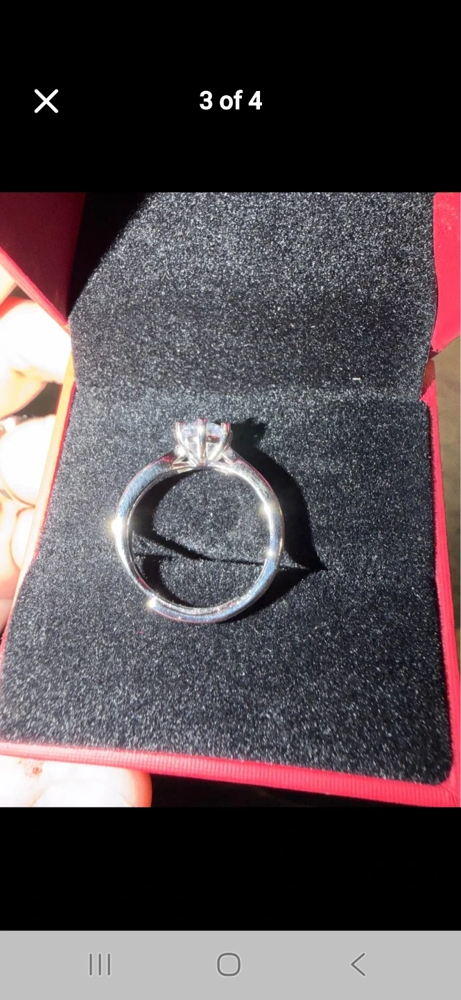 Beautiful engagement ring with a large center stone and smaller stones accenting the band. It comes in a red velvet jewelry box. The band is silver-toned metal and appears to be set with small, sparkling stones.