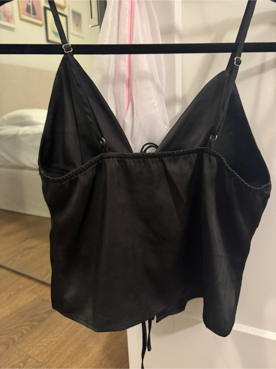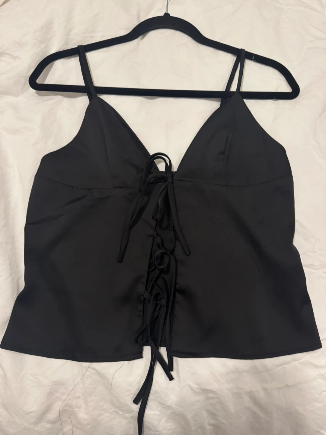 This satin black camisole tank top features a deep V-neck and adjustable spaghetti straps. It has a lace-up detail at the front for a touch of style.