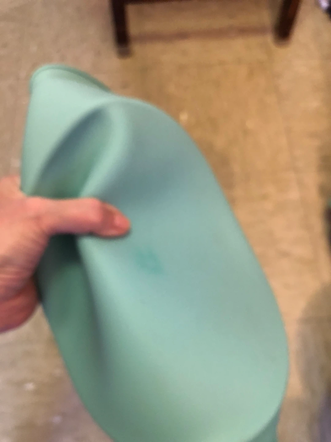 It's a teal color and made of silicone .This pan is perfect for baking cakes or other desserts!