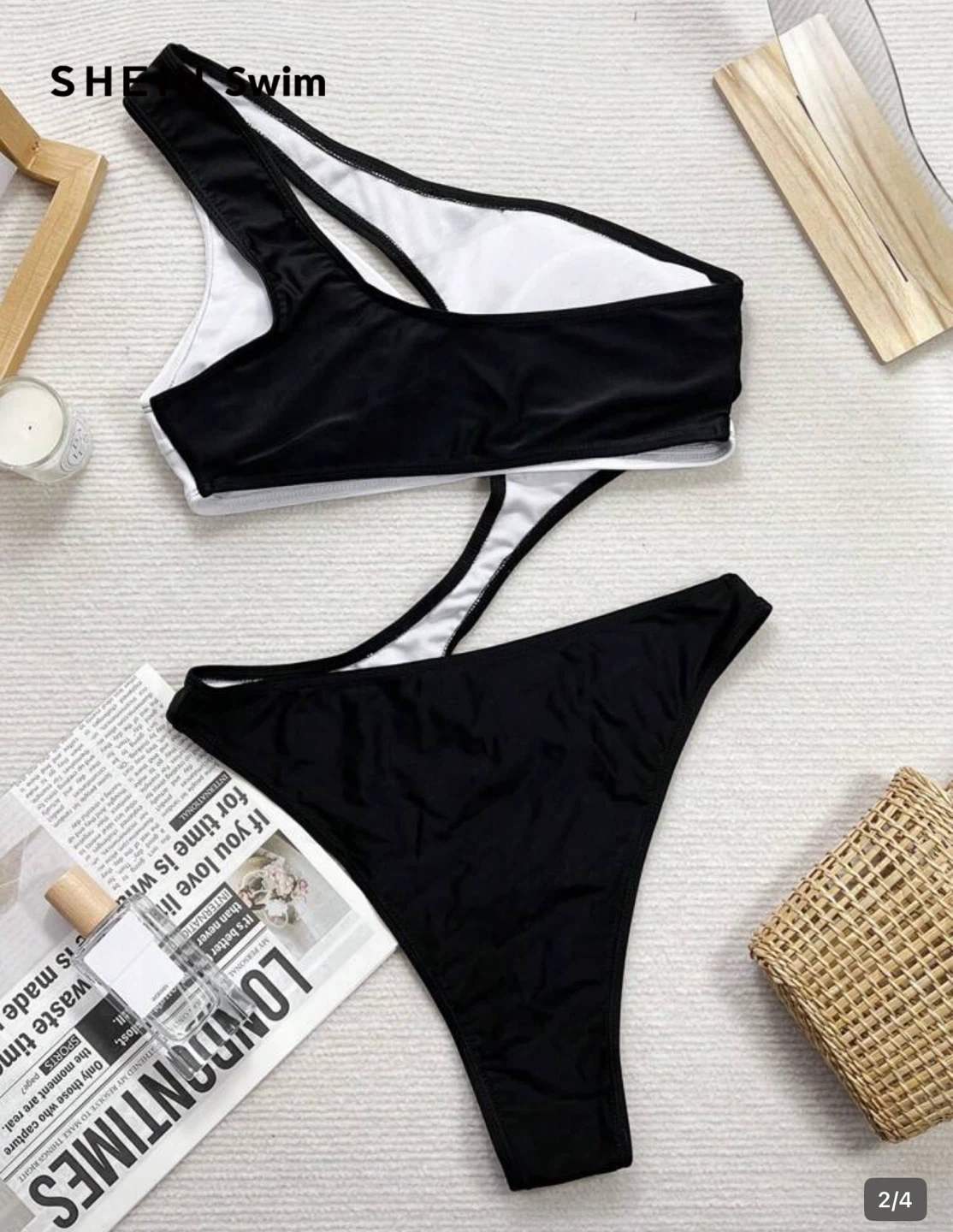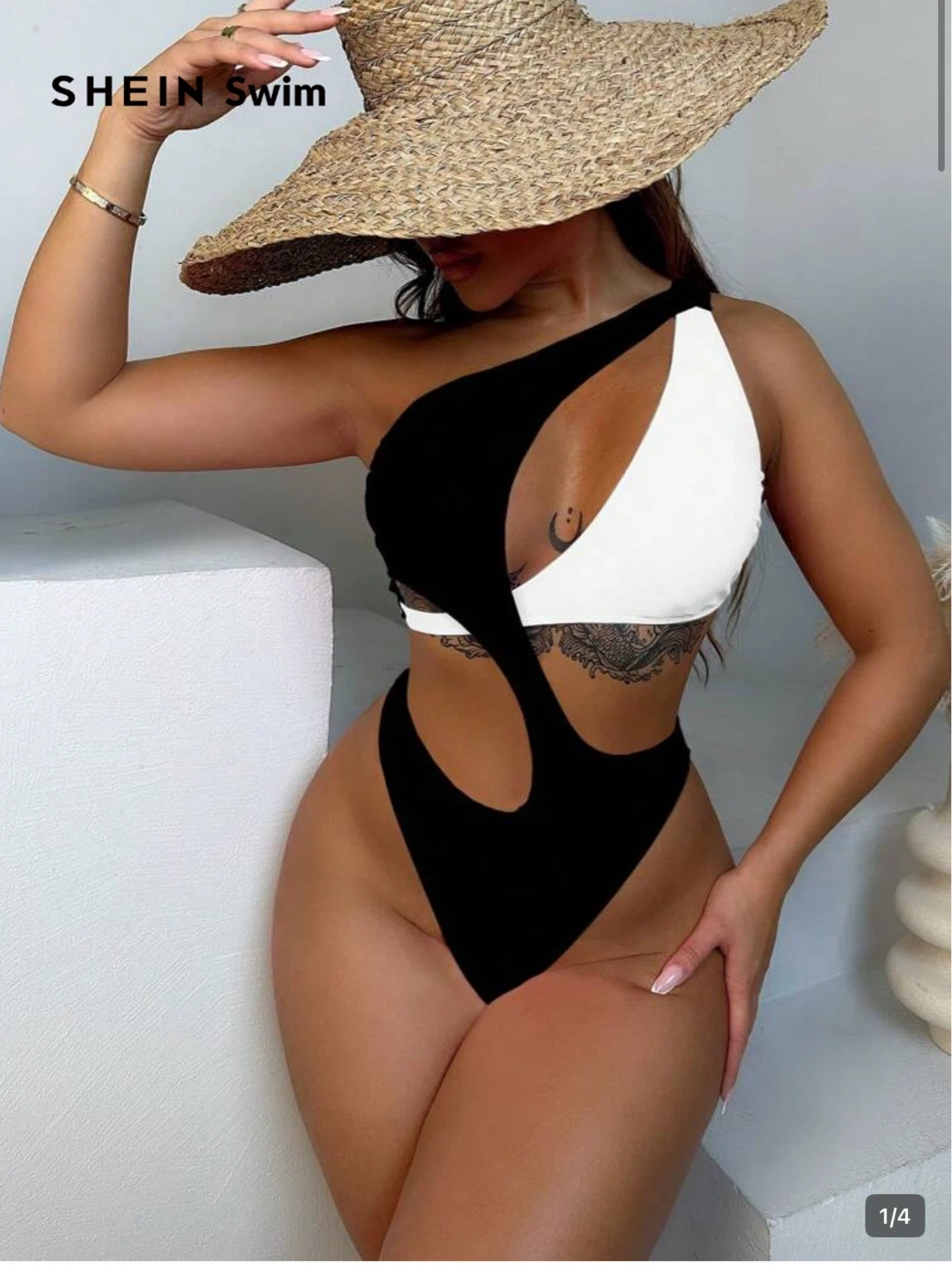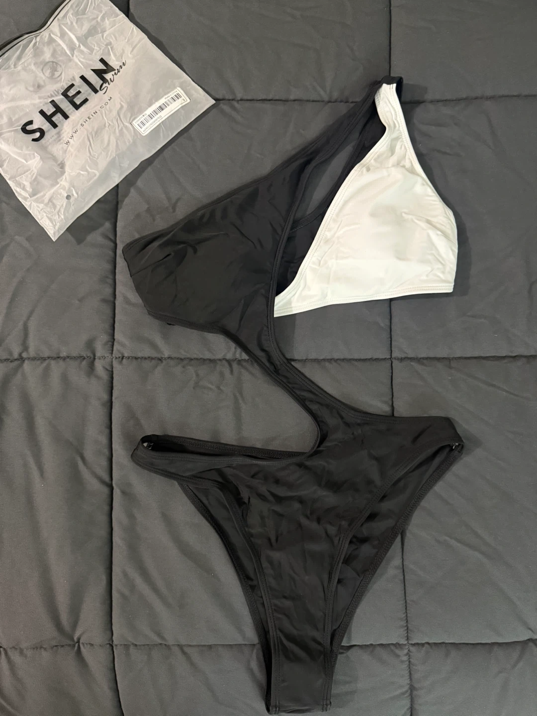 This is a black and white one-shoulder swimsuit with cutout details from SHEIN. It's made of a stretchy material. This suit's unique design is great for making a splash at the beach or pool!