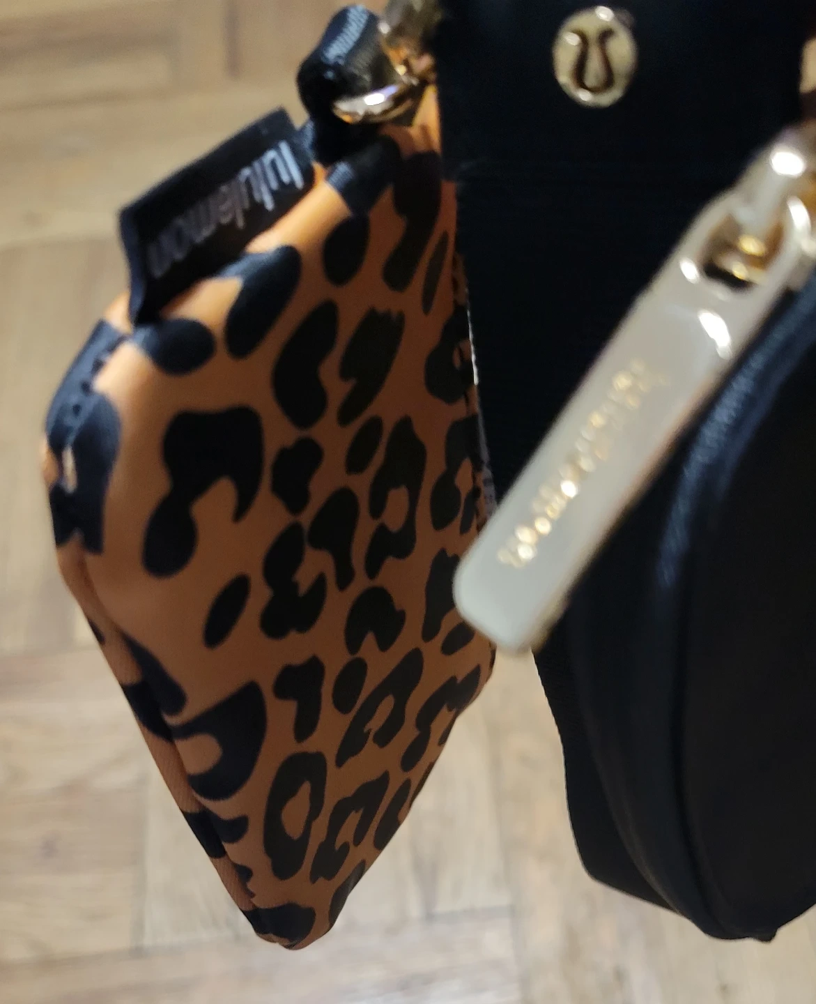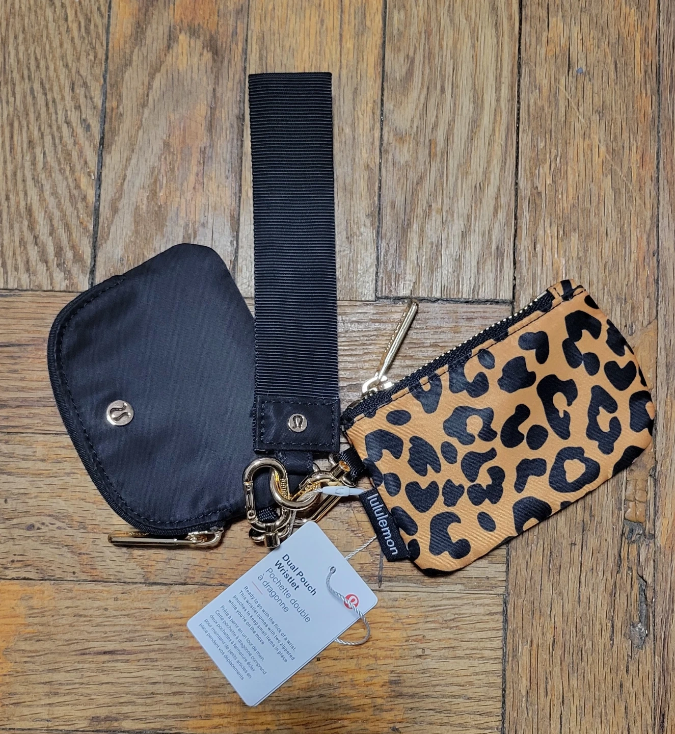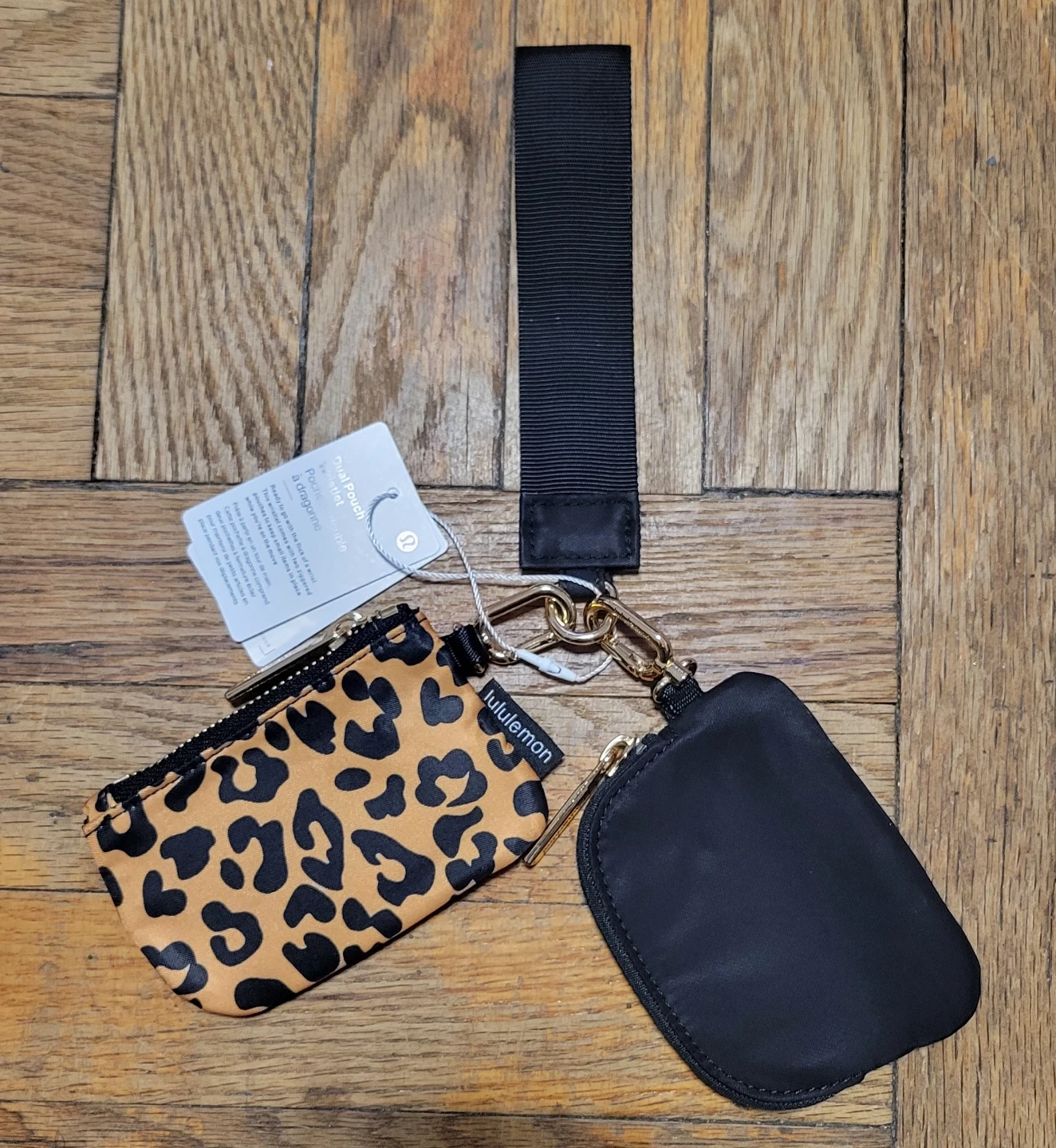 This is a Lululemon Dust Pouch Wristlet Double. It includes a black pouch and a leopard print pouch. They attach to a black wrist strap. It's great for keeping small essentials organized!