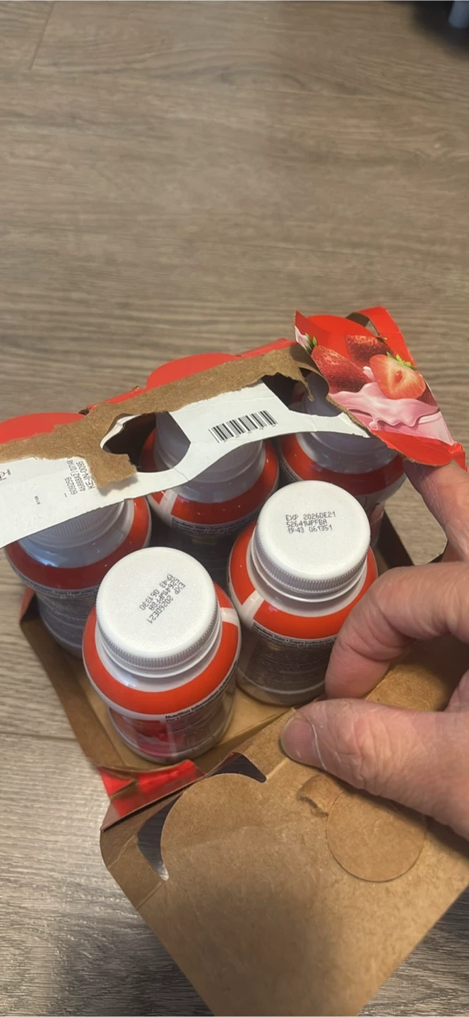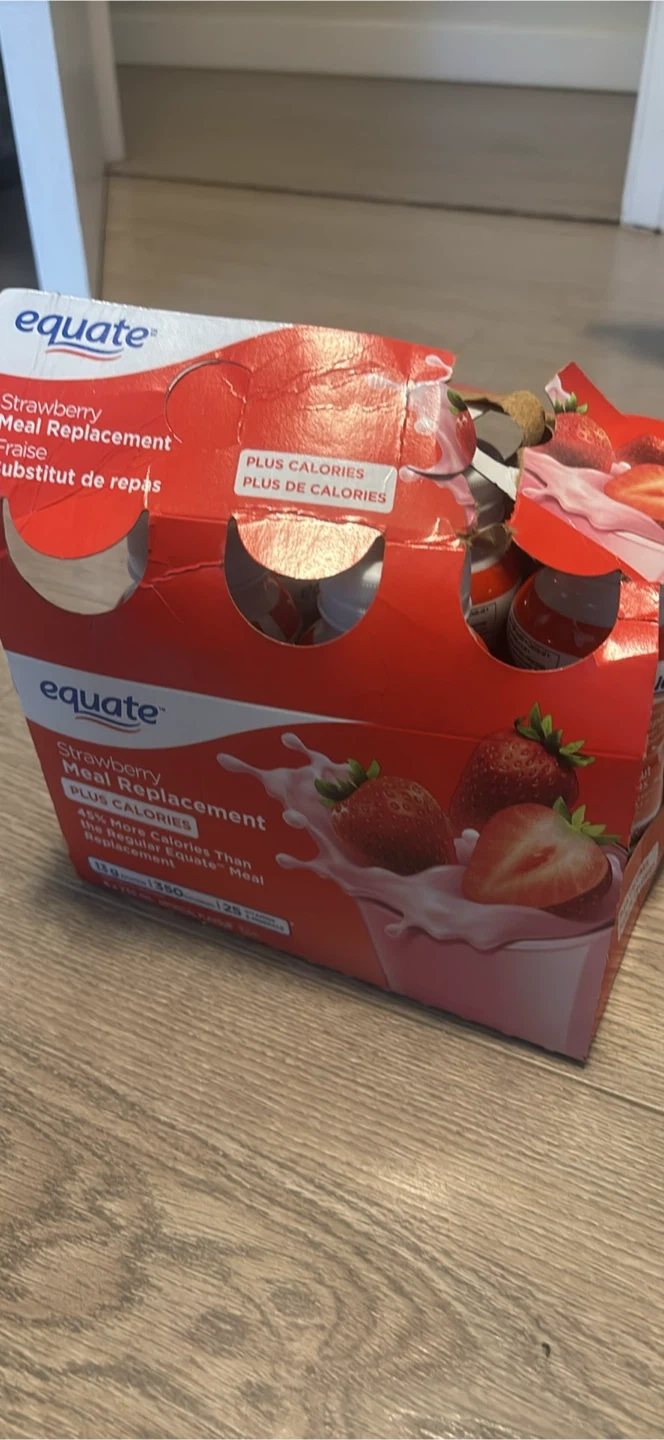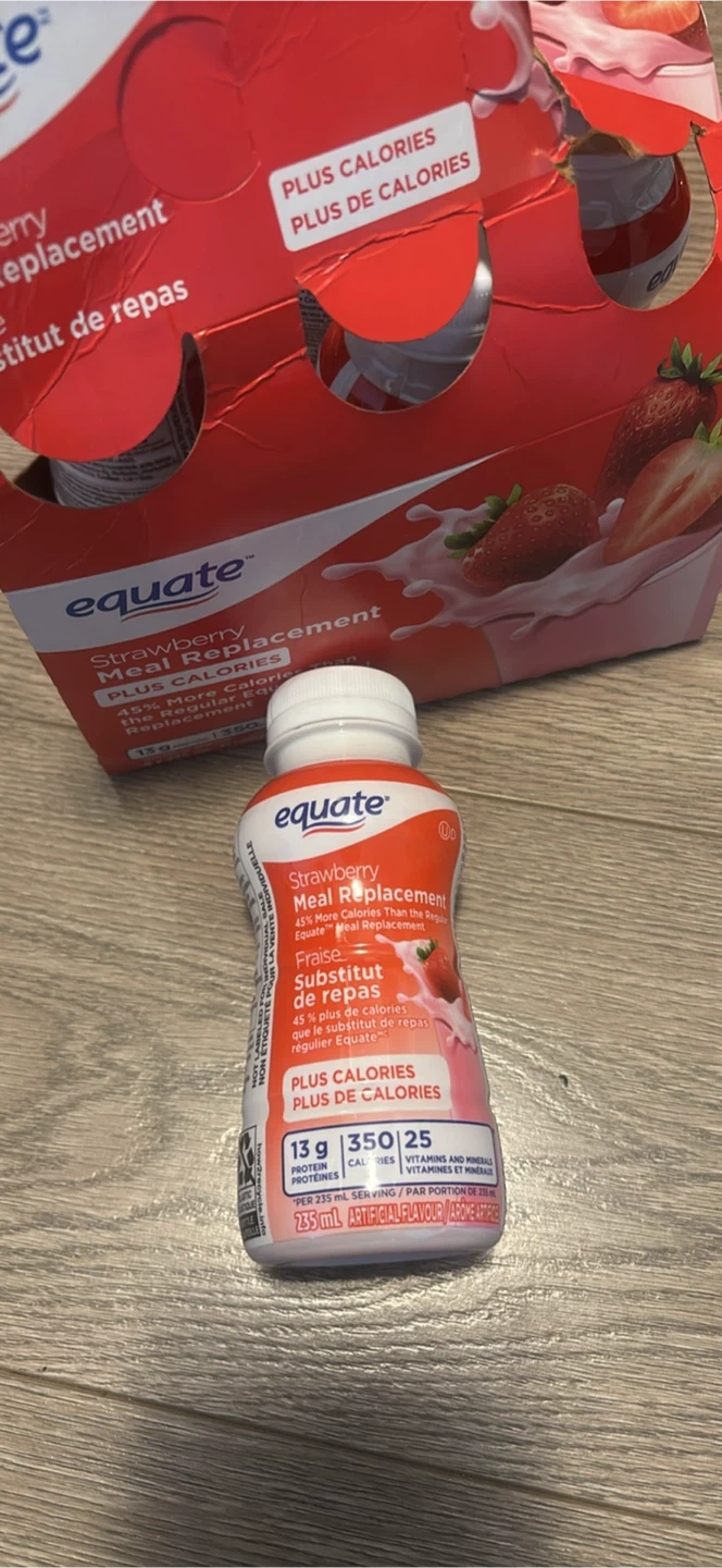 Equate Strawberry Meal Replacement shakes .Each bottle is 350 calories with 13g of protein. It's strawberry flavour and artificial. 5 bottles for $5