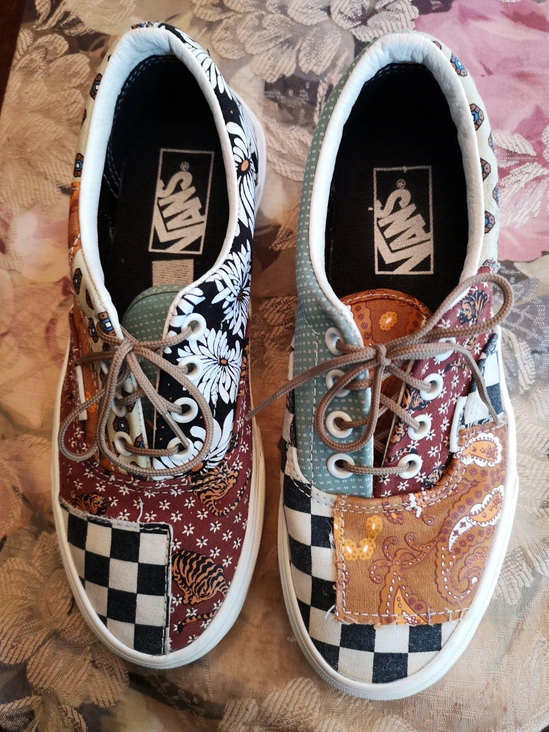 Vans Era sneakers in a unique patchwork design. Features floral, checkered, tiger, and paisley patterns. Comfortable and stylish for everyday wear!