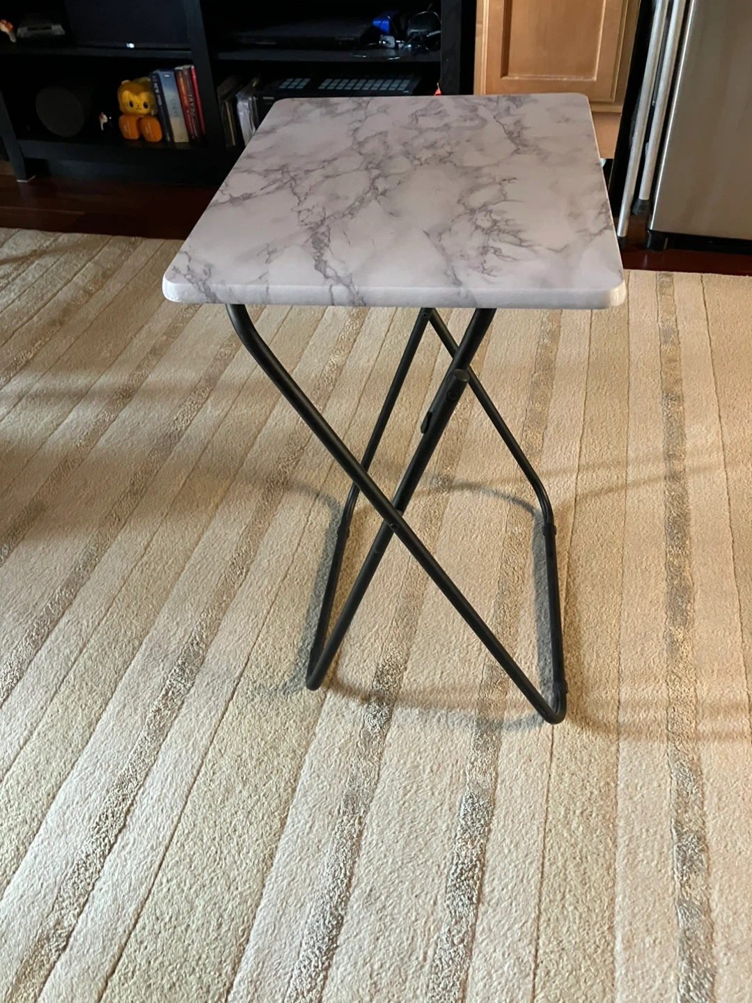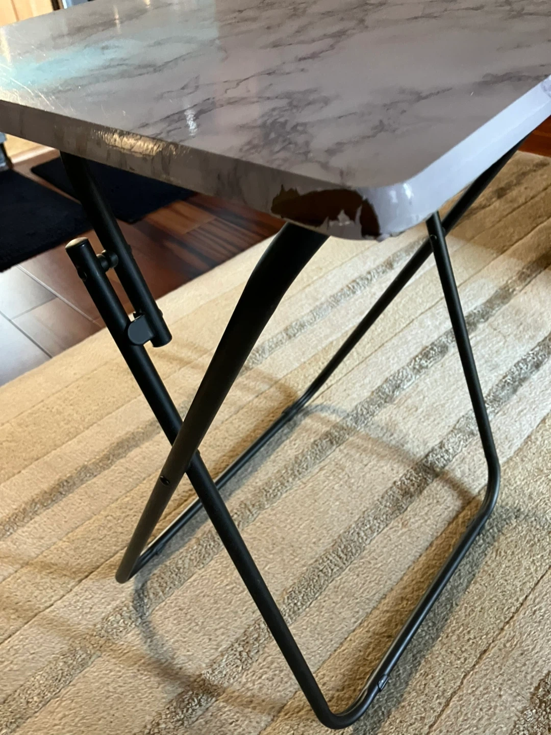 This is a folding tray table with a marble-patterned top. It features a black metal folding frame for easy storage. Surface shows some minor wear and tear around one edge. Cash and pick up only .