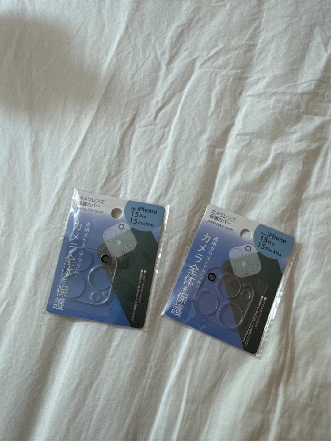 Protect your iPhone 15 Pro or 15 Pro Max cameras with these two clear lens covers. They offer full camera protection using transparent glass and acrylic materials. These covers fit the iPhone 15 Pro and 15 Pro Max models.