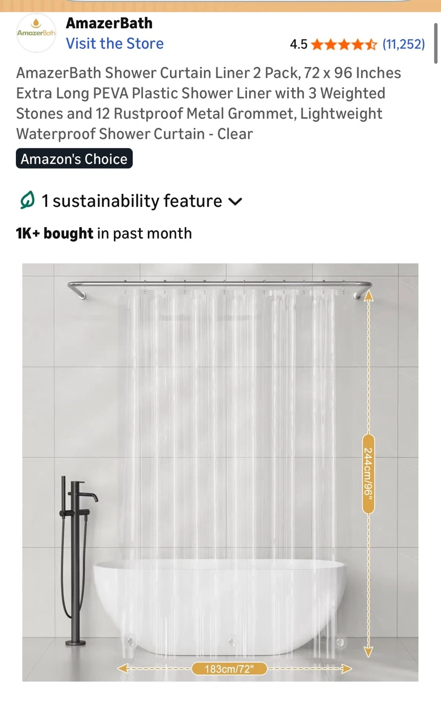 Selling a 2 pack of AmazerBath shower curtain liners. They are 72 x 96 inches and made of extra long PEVA plastic. They also have 3 weighted stones and 12 rustproof metal grommets. It's also lightweight and waterproof