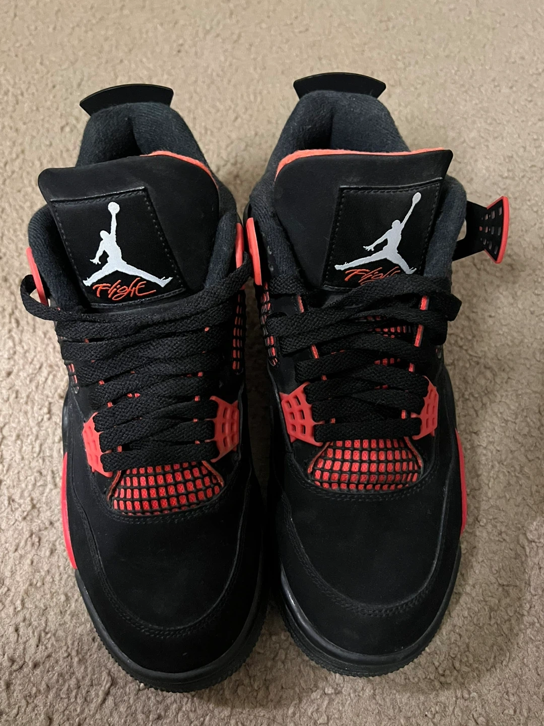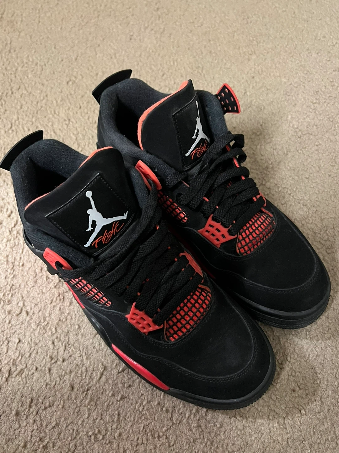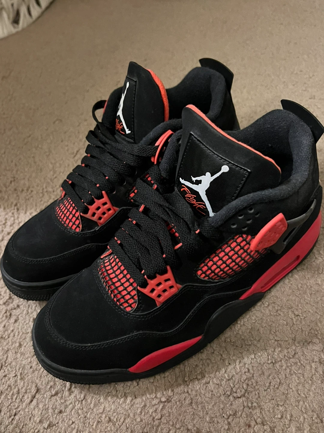 Selling a pair of Air Jordan 4 "Red Lightning" sneakers. Black suede uppers with bright red accents and mesh detailing. These are a size 8.5W