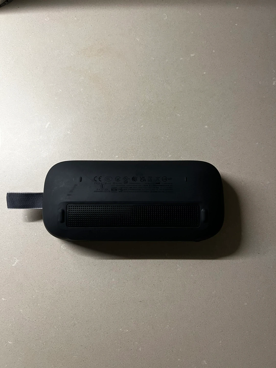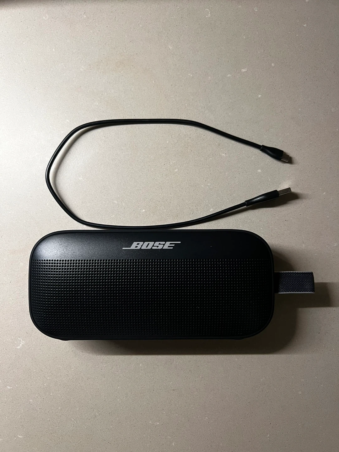 This is a black Bose SoundLink Flex portable speaker. It's water-resistant and dustproof. It comes with a USB-C charging cable.