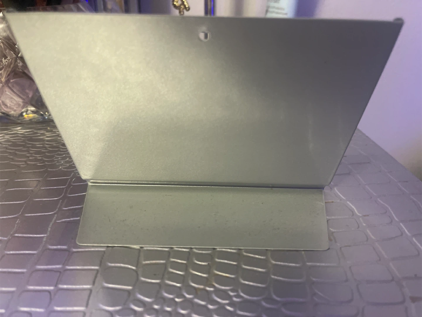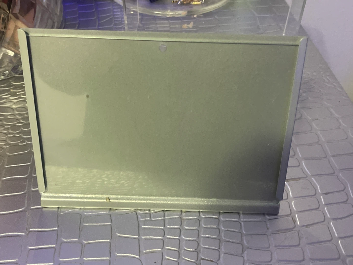 This is a simple metal display stand, likely for photos or signs. It's a neutral grey colour and has a sturdy base. It's useful for displaying small items on a desk or shelf.