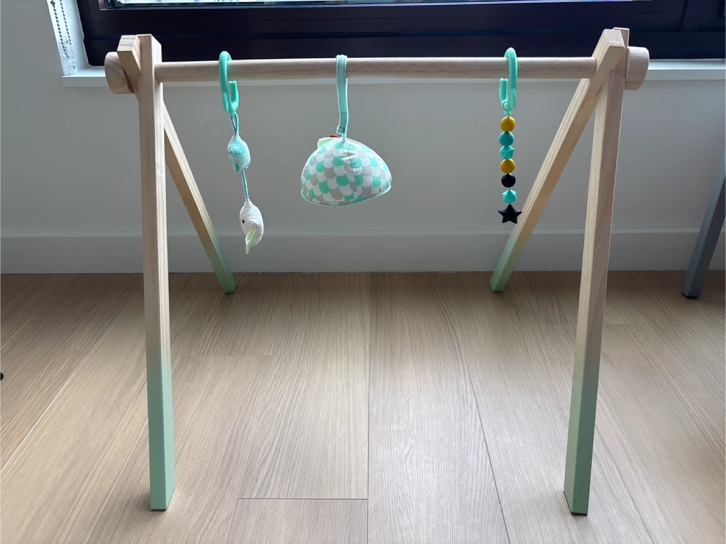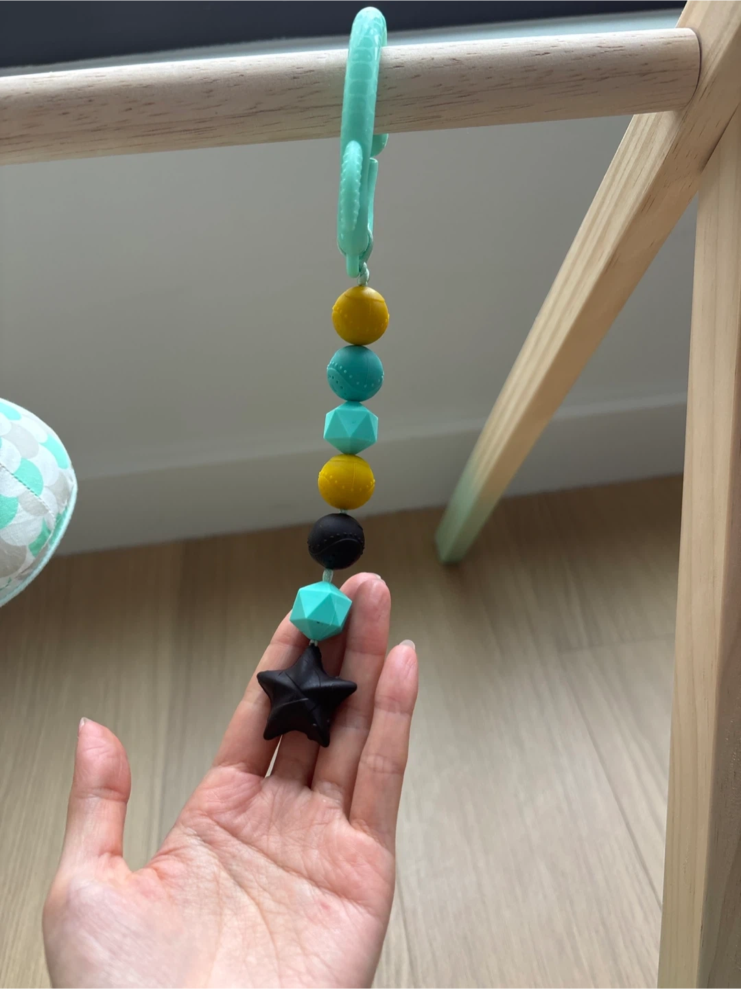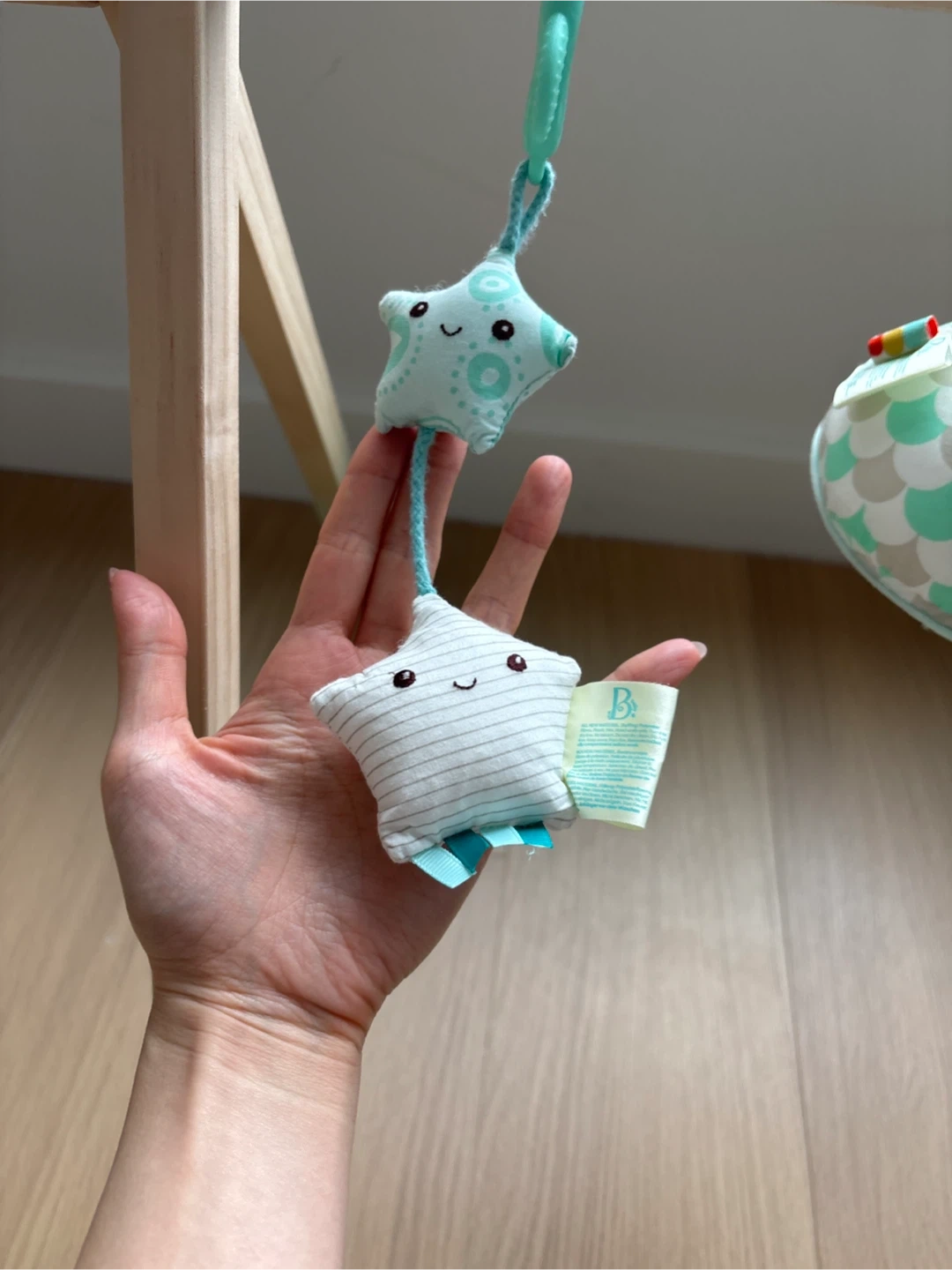 This baby gym features a wooden frame with colorful hanging toys. It includes plush stars, a textured ball, and a mirror for sensory exploration. Babies can reach and grasp for the dangling toys, promoting motor skills.
