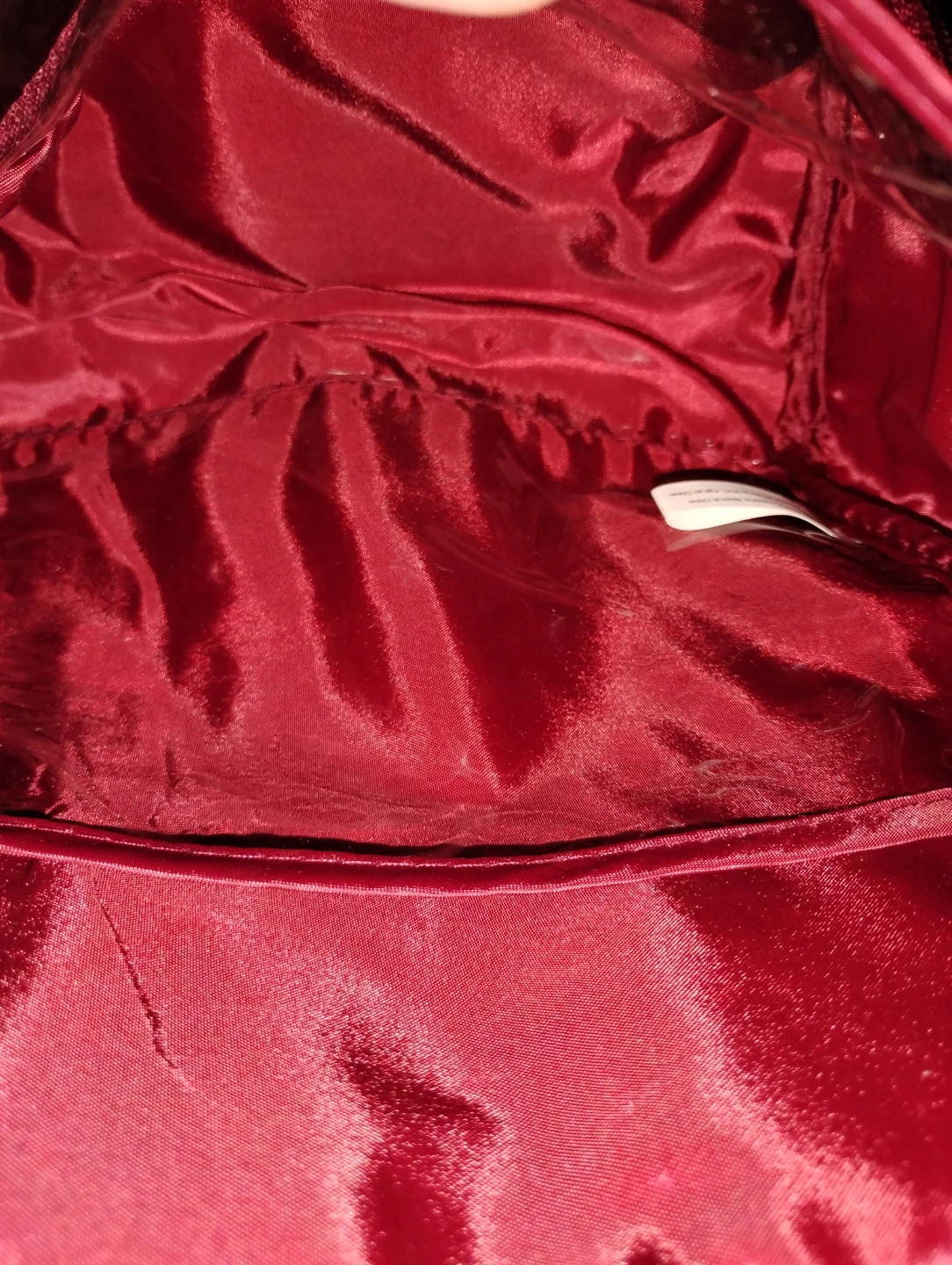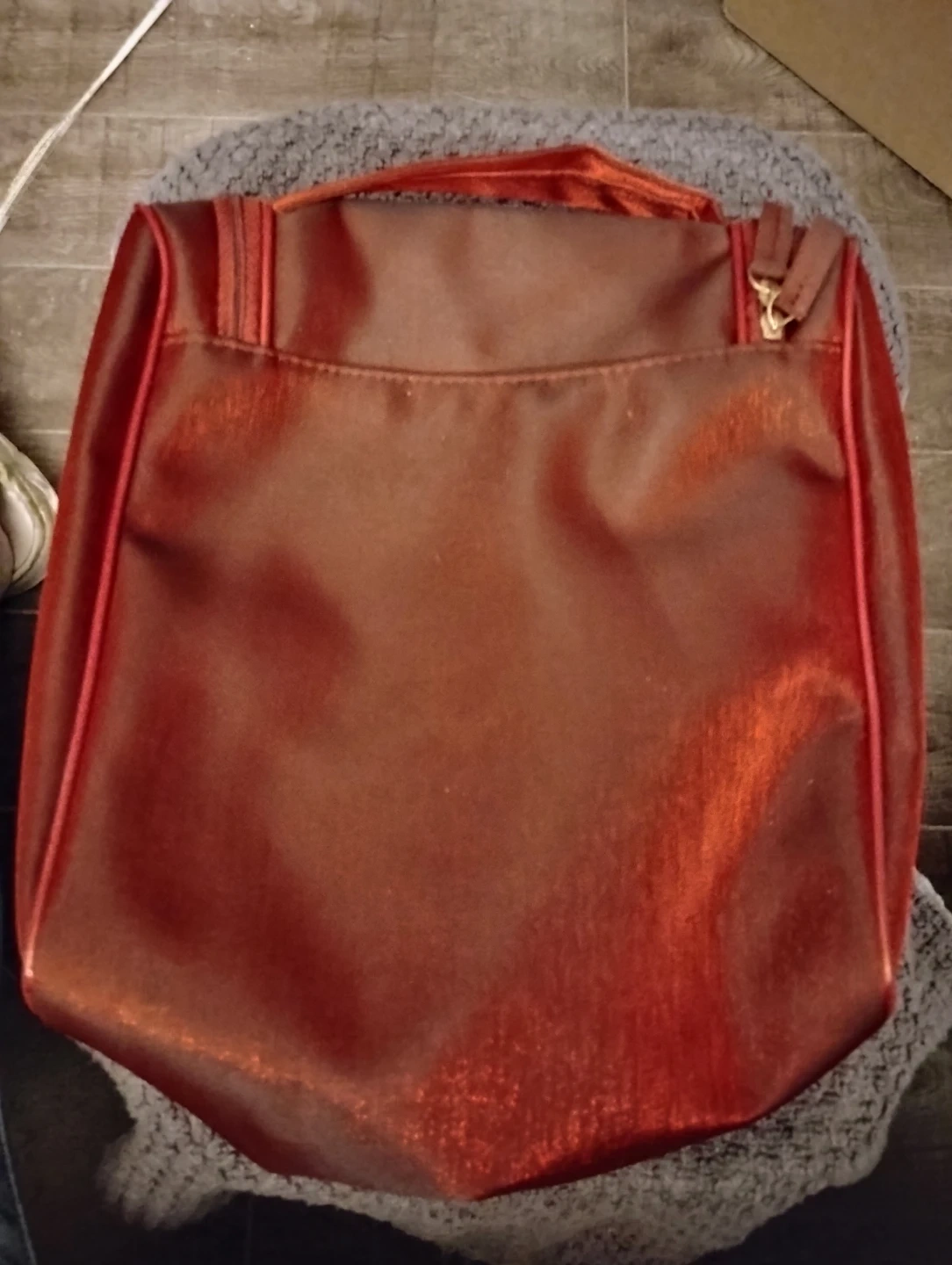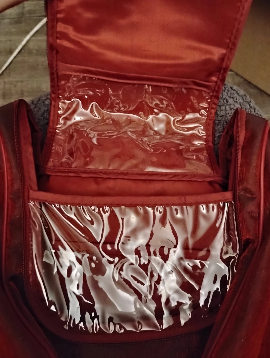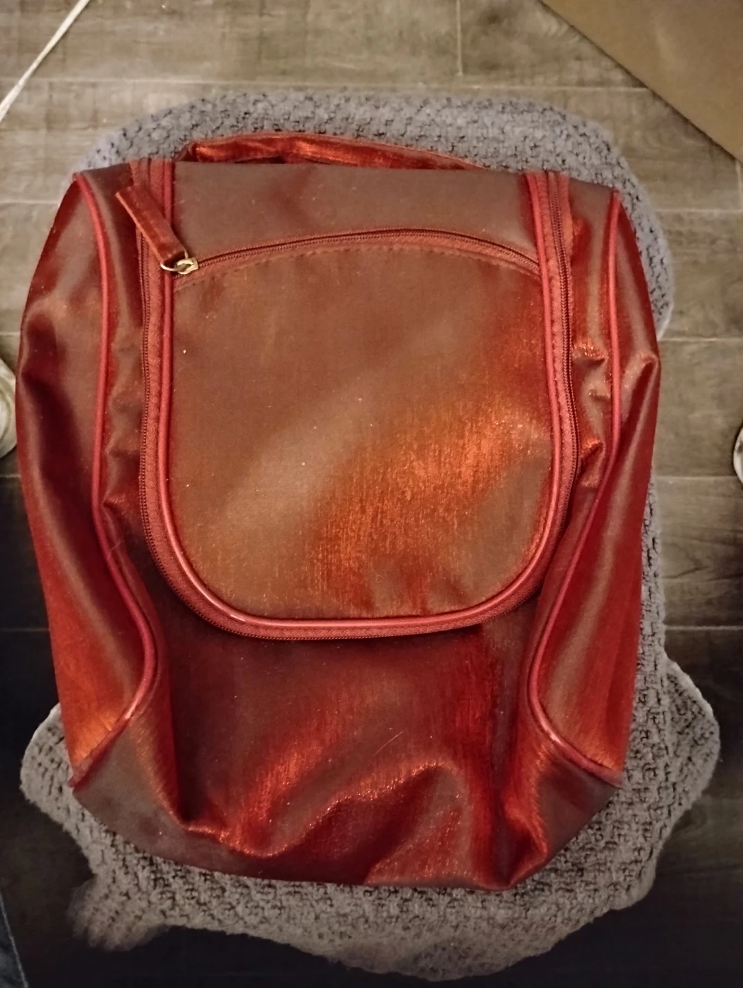 NEW! CRANBERRY COLOUR TRAVEL TOILETRIES BAG. NEVER USED, A BIT SQUISHED FROM BEING IN A BOX BUT IT IS IN PRISTINE CONDITION. HAS ONE OUTSIDE POCKET, AND TWO INSIDE POCKETS. SEE PHOTOS.