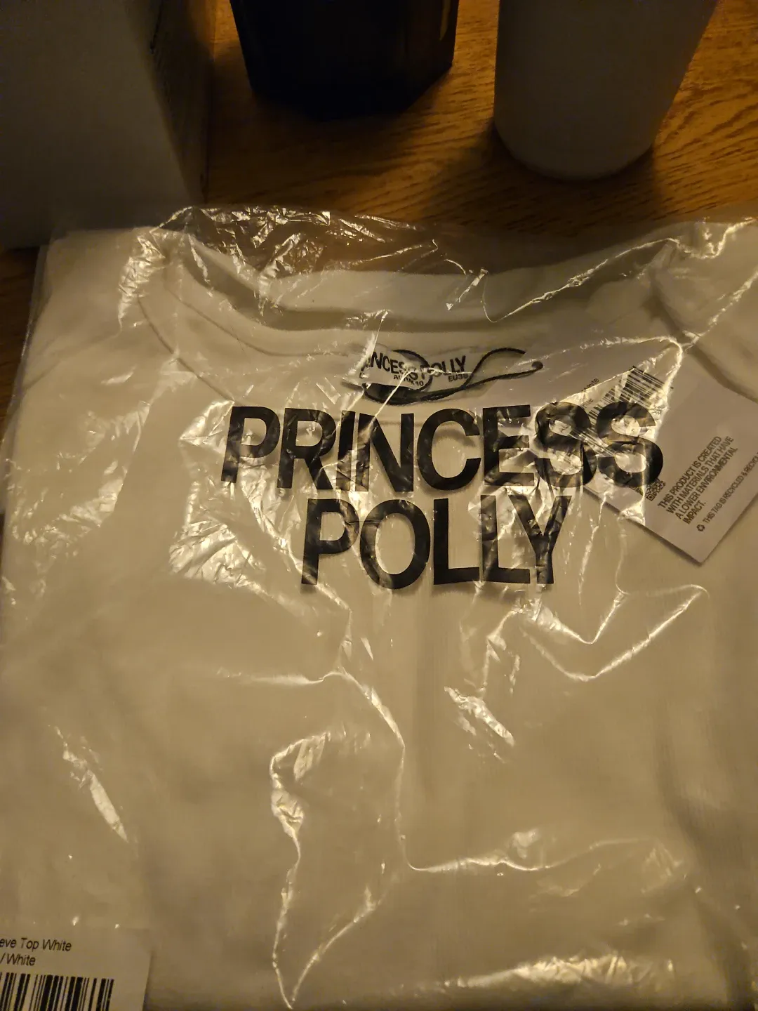 This is a white short sleeve top from Princess Polly. It's made with materials that have a lower environmental impact. The tag is recycled and recyclable! US size 6.AU/UK size 10. EU size 38.