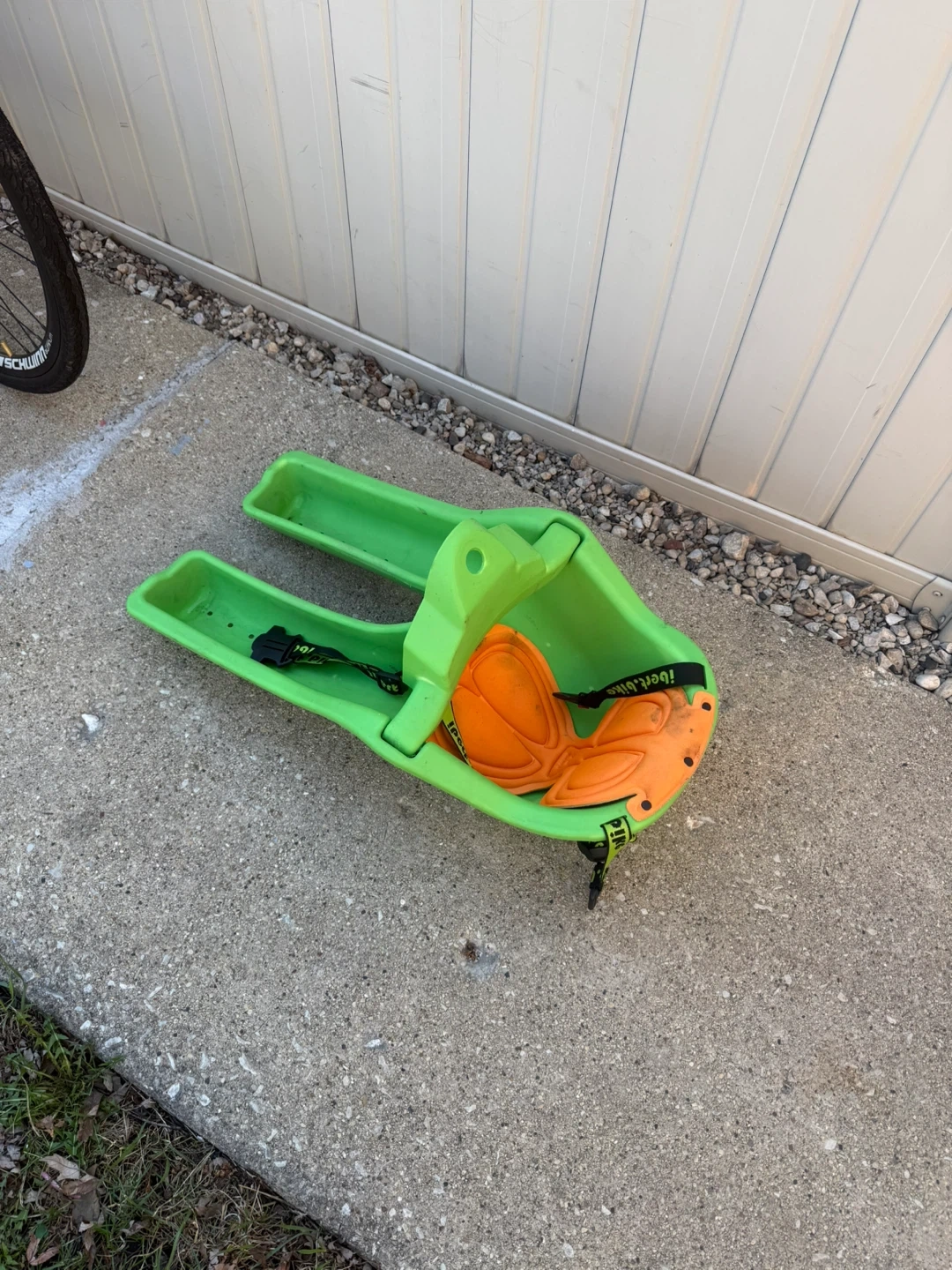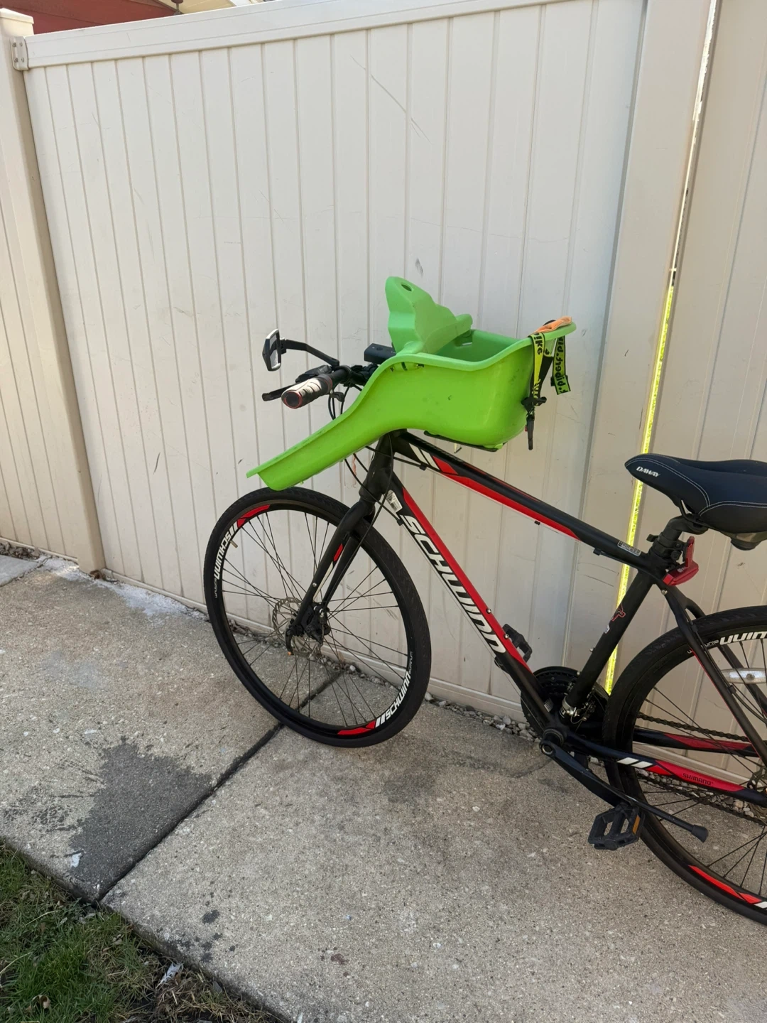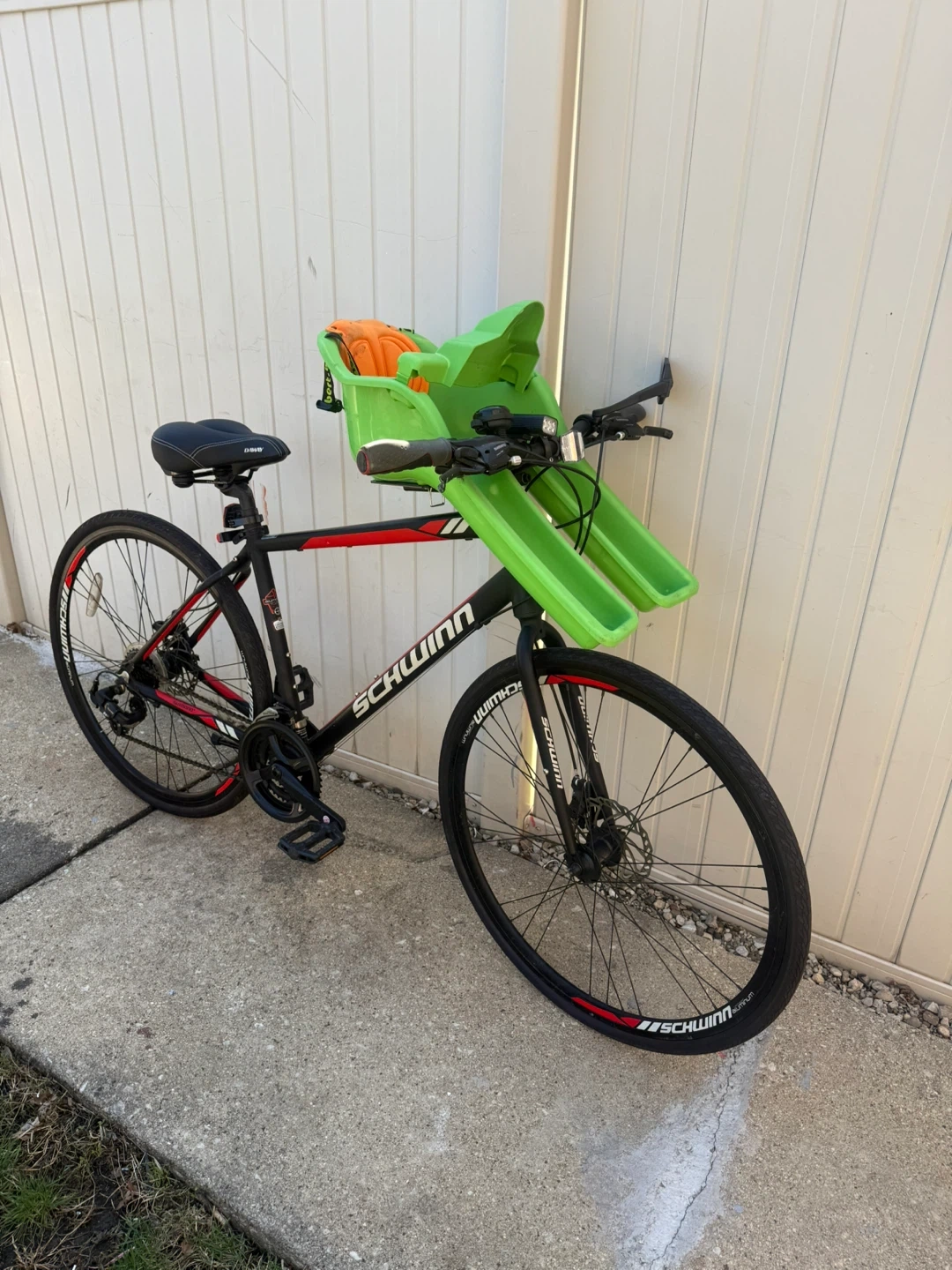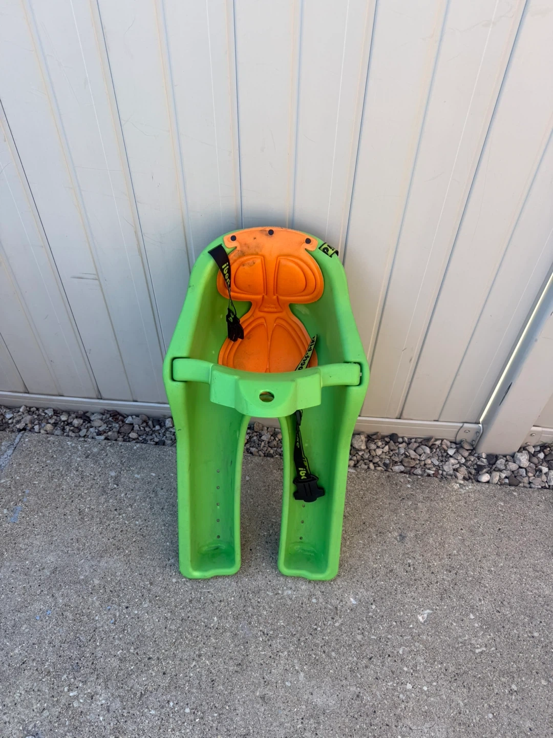 Front-mounted bicycle seat for a child. Made of green plastic with an orange padded seat and straps. It attaches to the handlebars and frame. Great for taking your little one on bike rides!