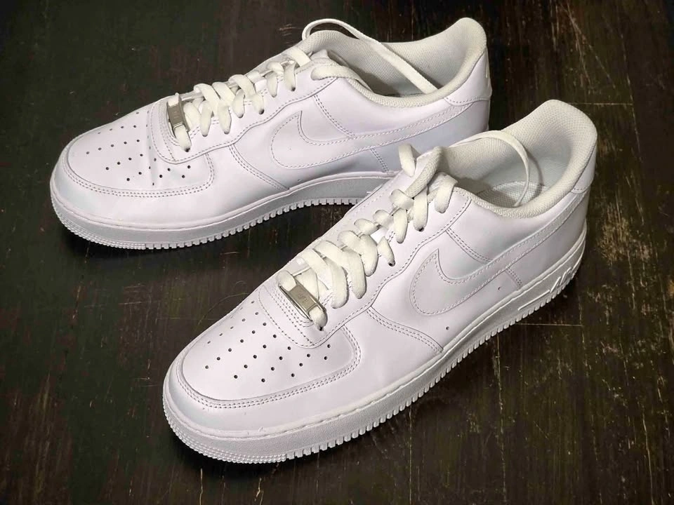 Classic Nike Air Force 1 sneakers in an iconic all-white design with timeless style. Comfortable fit, durable leather upper, and versatile for everyday wear. Available in Men's sizes 8, 9, 11, 11.5, 12. Brand new.